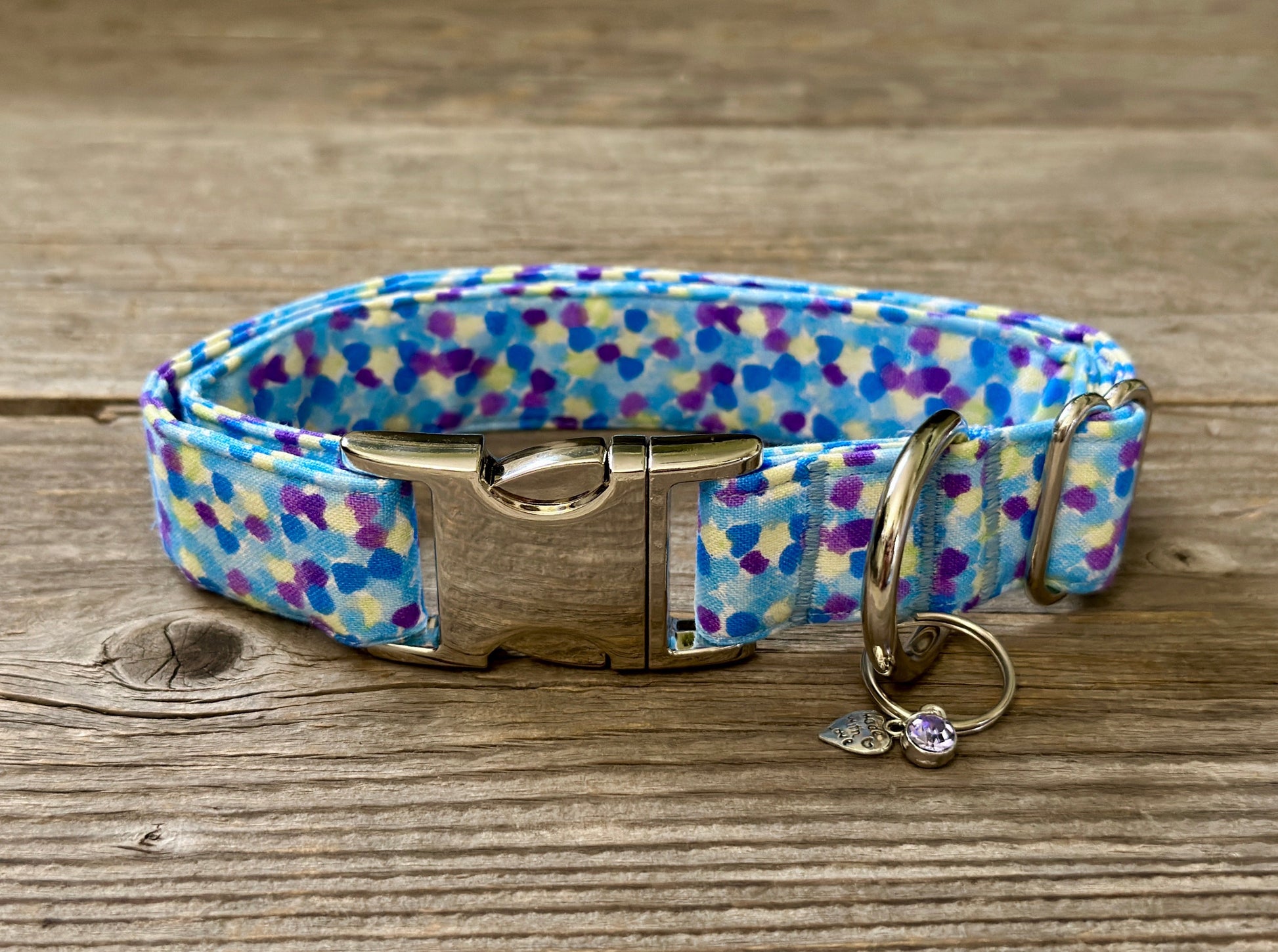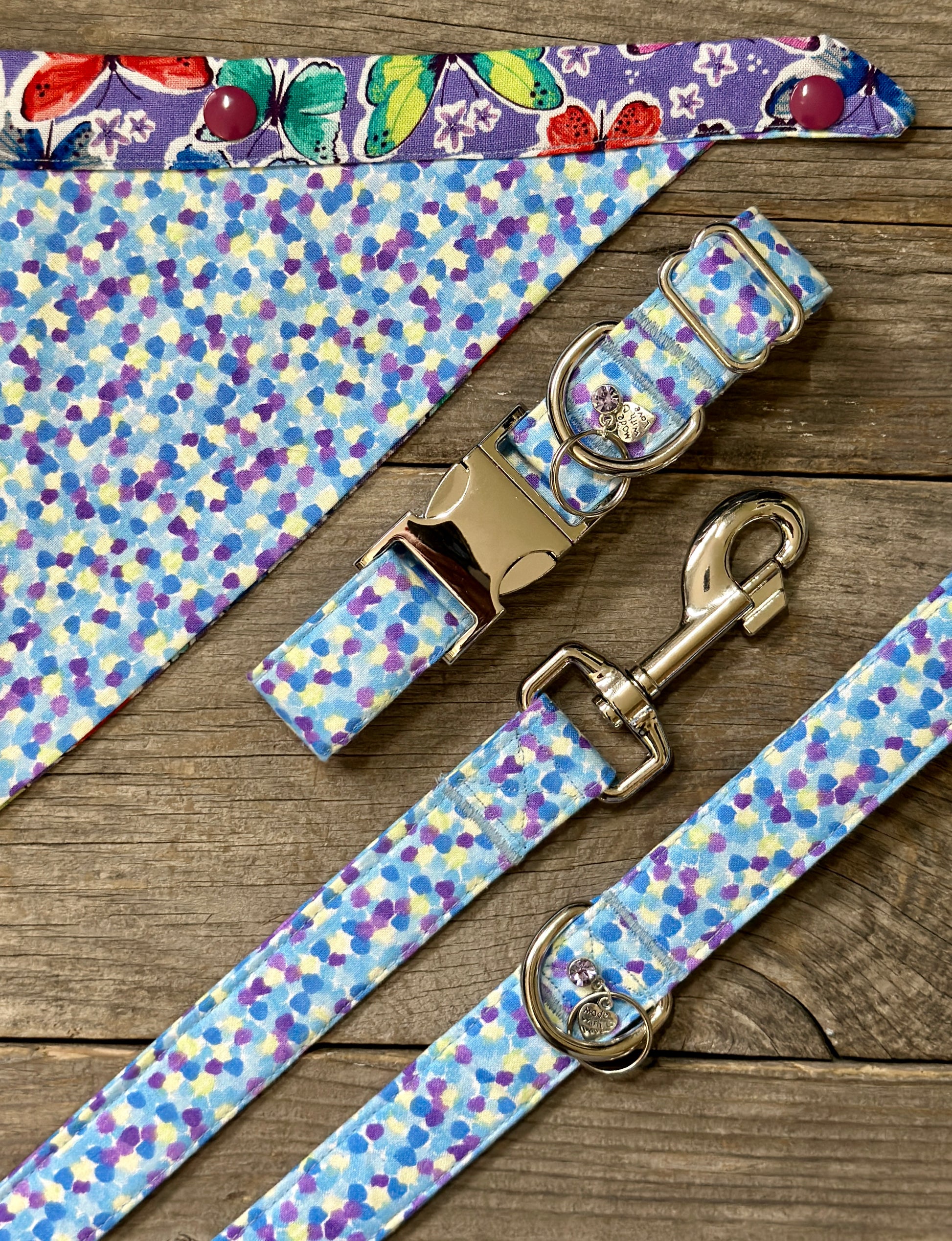 This collar has a matching leash option, don't forget to check it out! Our leashes are 5-foot long, 1-inch wide, and come with a heavy-duty silvertone metal spring-loaded hook that attaches to the D-ring on your pet's collar**. Each collar comes with a coordinating charm*. This hand-crafted collar is made with 100% cotton fabric and your choice of a metal or plastic buckle with a matching adjuster. Each collar is made with a reinforced metal D-ring. This elegant collar is sure to last for years.