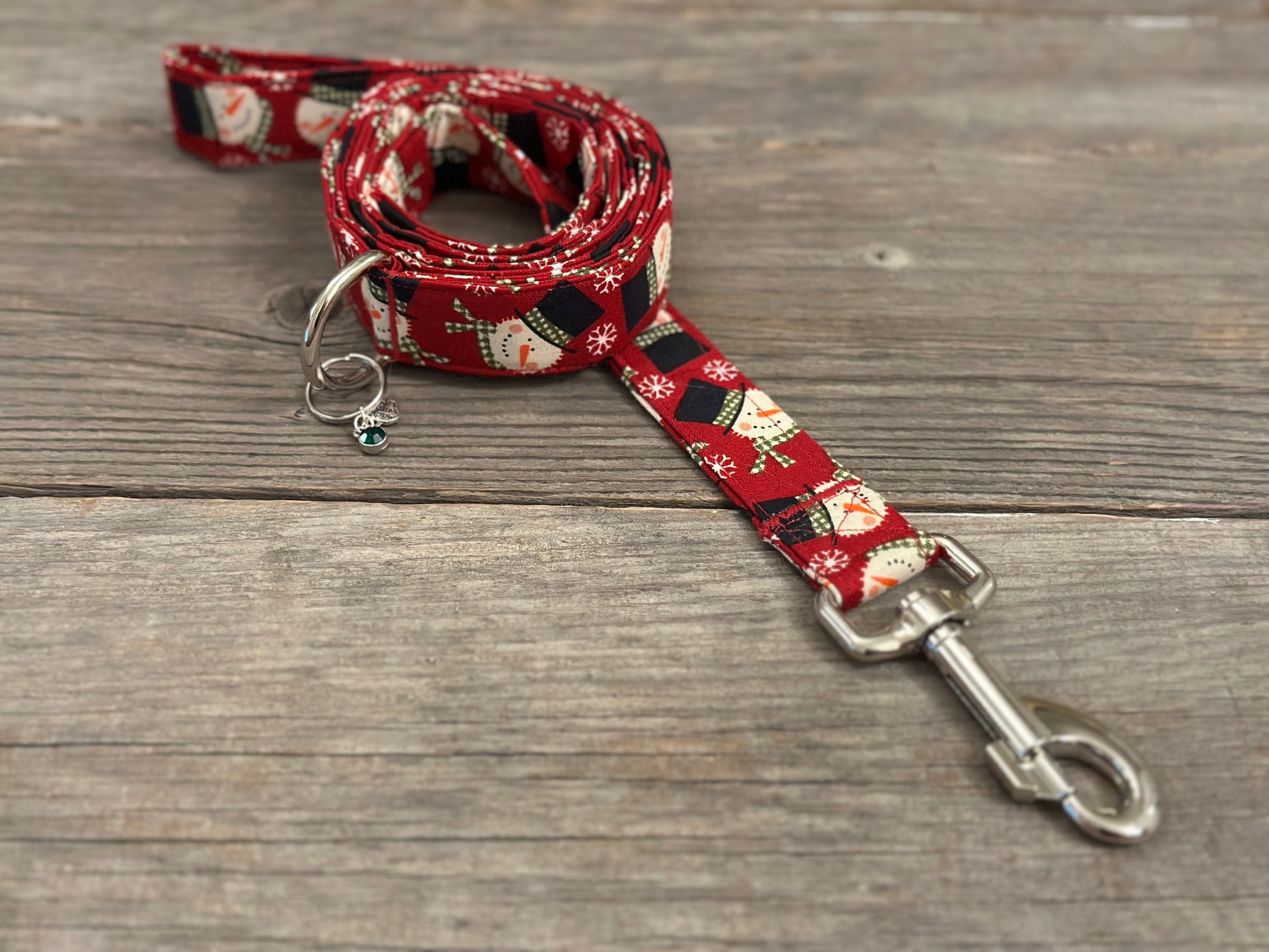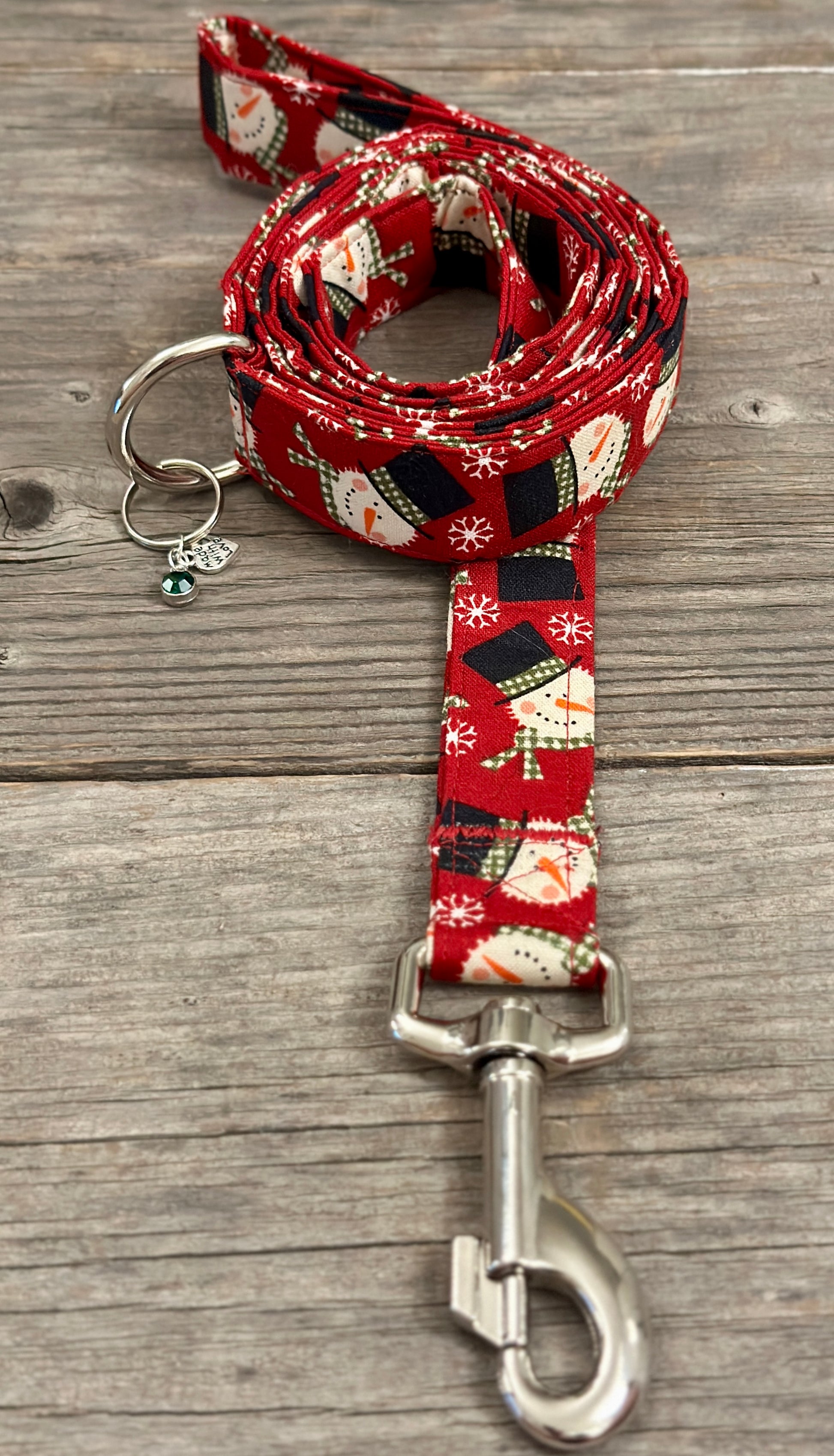 Our handmade leashes feature a heavy-duty metal spring-loaded hook that attaches to the D-ring on your pet's collar. Every leash is 1 inch wide and five feet long and has a D-ring at the handle to attach keys, poop bags, or anything else you need.