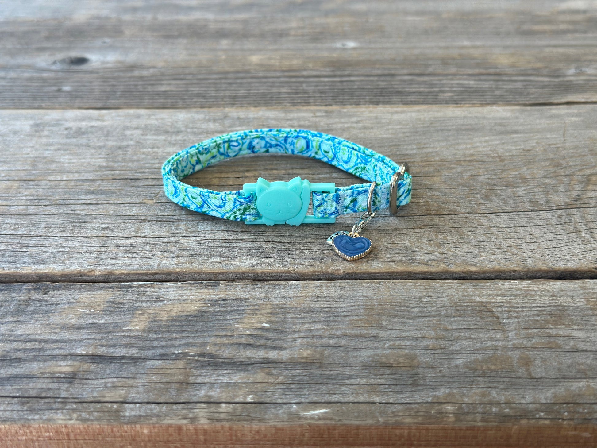 Our cat collars are 3/8" wide and have a plastic breakaway buckle.