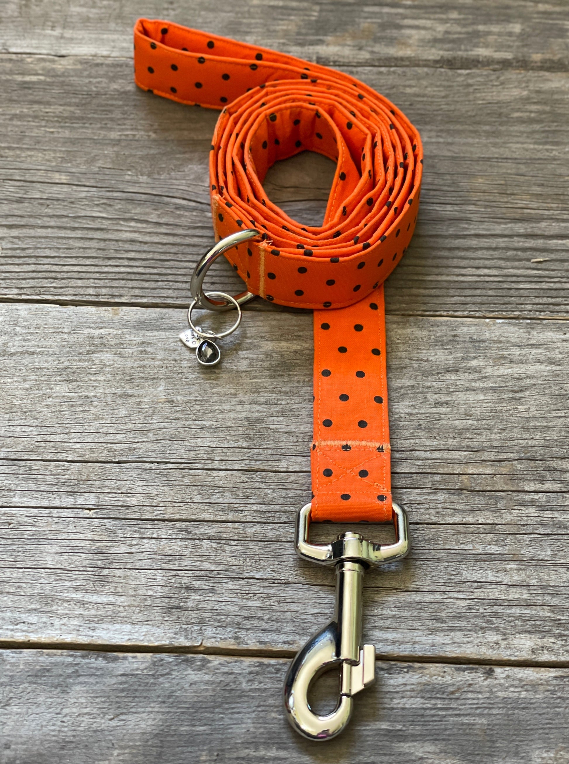 Our dog leashes are 1" wide and 5' long. Upon special request, we can make leashes longer or shorter. We can also make them 5/8" wide.