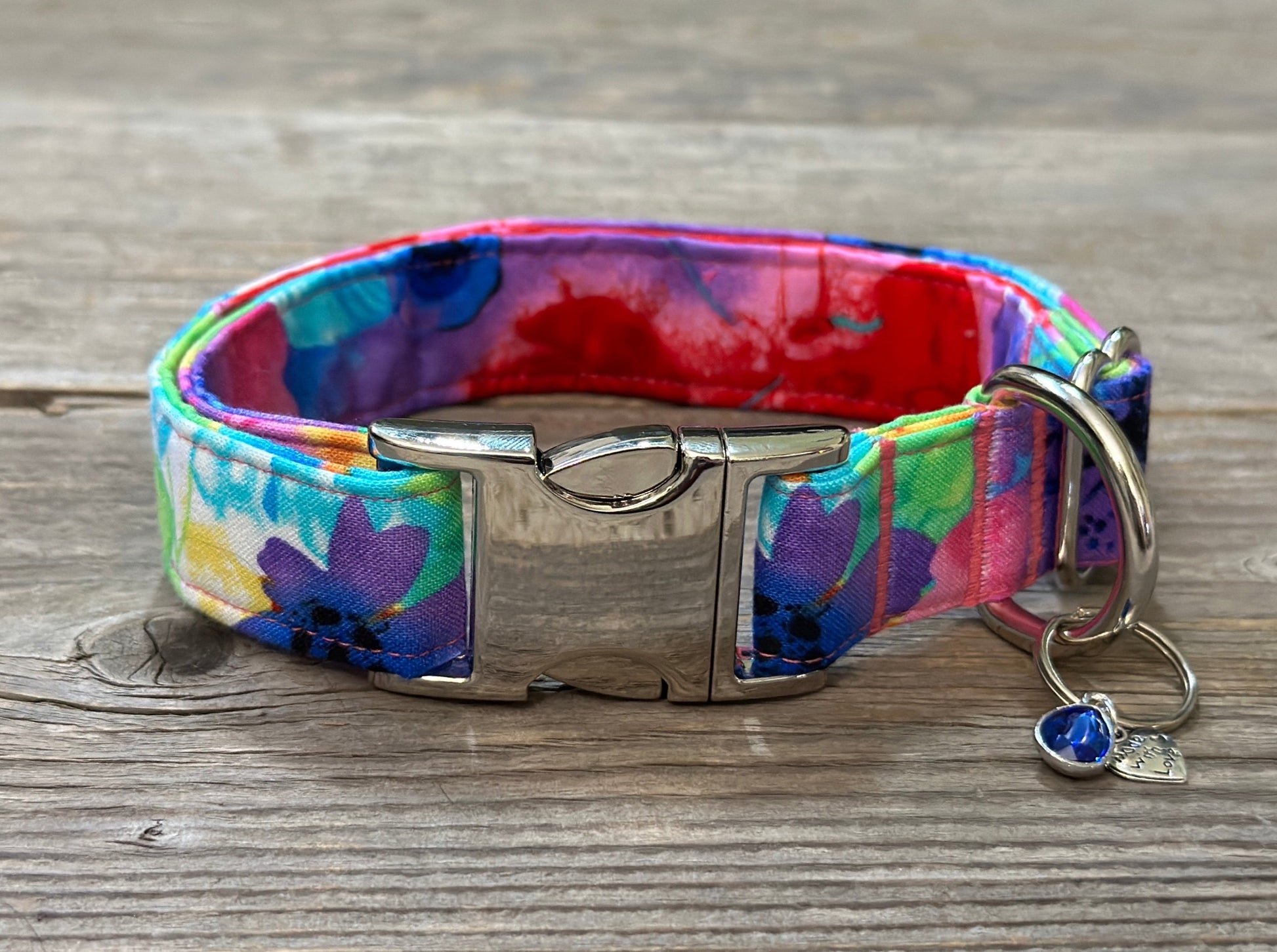 *Each collar comes with a coordinating charm*. This hand-crafted collar is made with 100% cotton fabric and your choice of a metal or plastic buckle with a matching adjuster. Each collar is made with a reinforced metal D-ring. This elegant collar is sure to last for years.