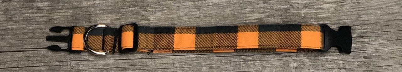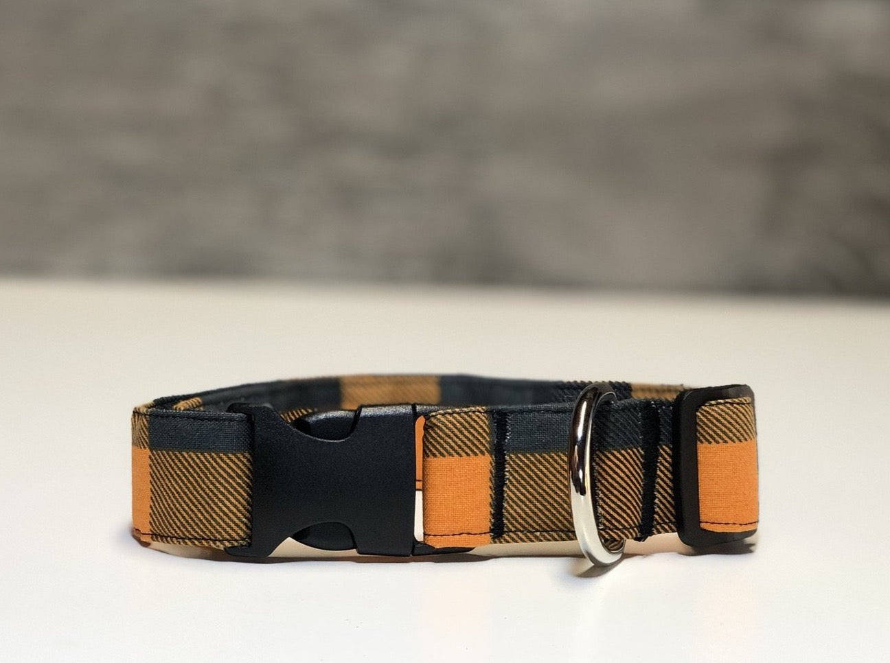 The smell of fall is in the air and it’s time to rake the leaves and trim the trees. This collar makes you want to chop wood for a fire on a crisp fall day. It features bright orange and black plaid and will make you want to cozy up with the family. Each collar comes with a coordinating charm*. This hand-crafted collar is made with 100% cotton fabric and your choice of a metal or plastic buckle with a matching adjuster. Each collar is made with a reinforced metal D-ring. This elegant collar is sure to last for years.