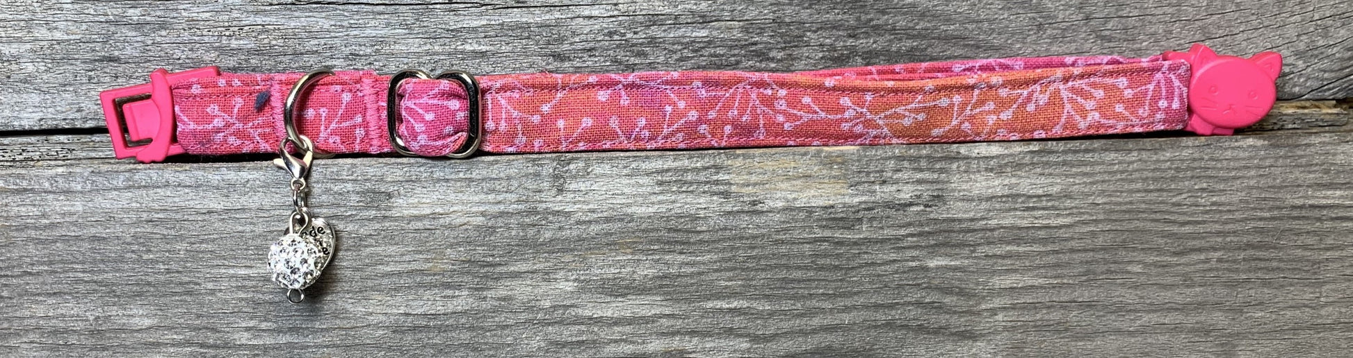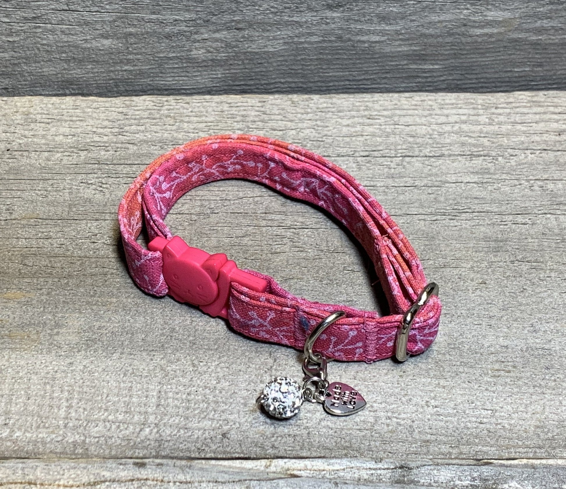 This collar will blow you away with its stunning color combination. Make a Wish features a gentle gradient of dark pink and orange, with gentle wisps of purple on the background. This collar is finished off with dandelion tendrils. Each collar comes with a coordinating charm*. This hand-crafted collar is made with 100% cotton fabric and a breakaway clasp. This elegant collar is sure to last for years.