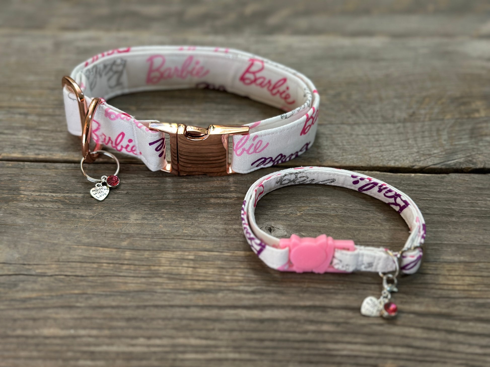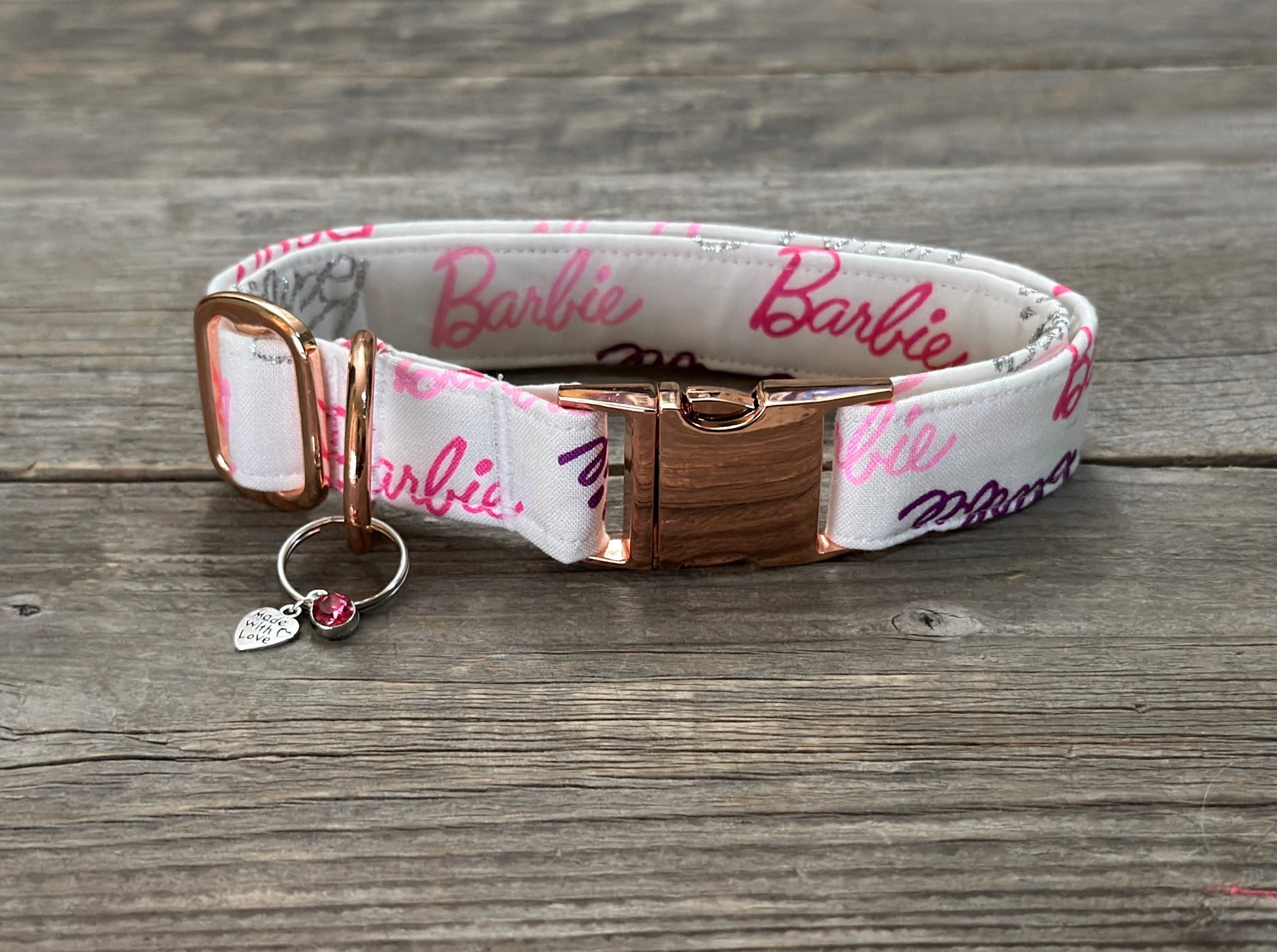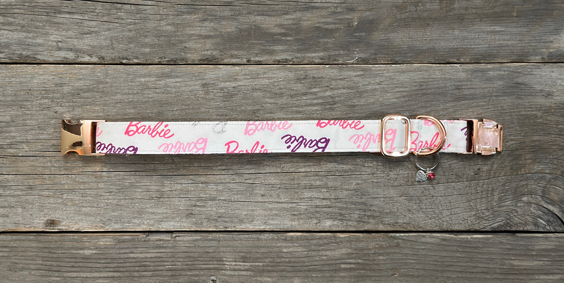 This collar has a matching leash option, don't forget to check it out! Each collar comes with a coordinating charm*. This hand-crafted collar is made with 100% cotton fabric and your choice of a metal or plastic buckle with a matching adjuster. Each collar is made with a reinforced metal D-ring. This elegant collar is sure to last for years.