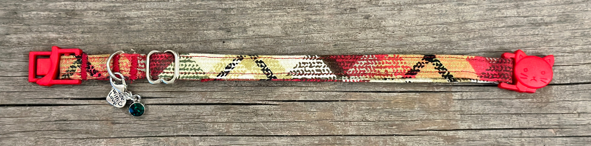 Our cat collars are 3/8" wide and have a plastic breakaway buckle.
