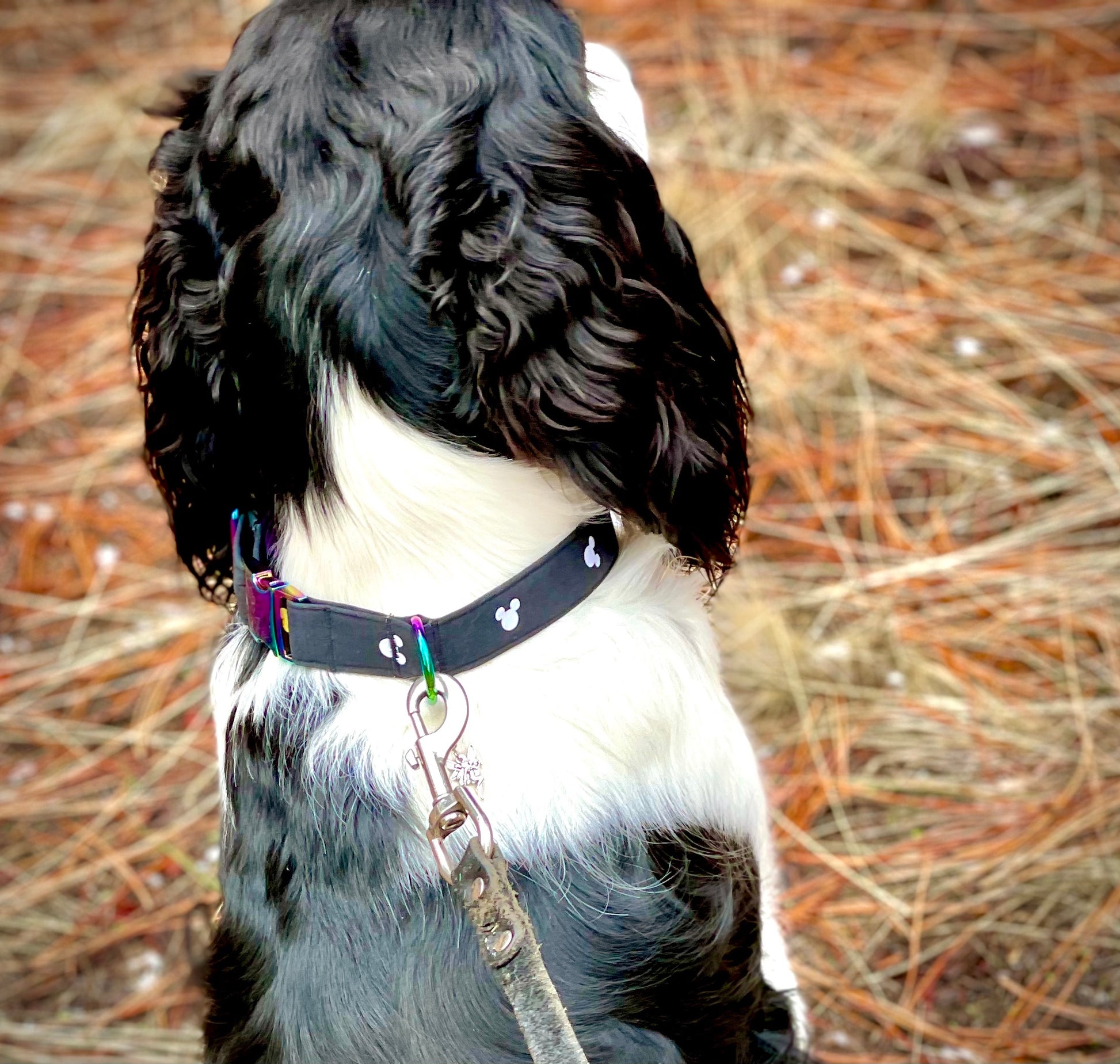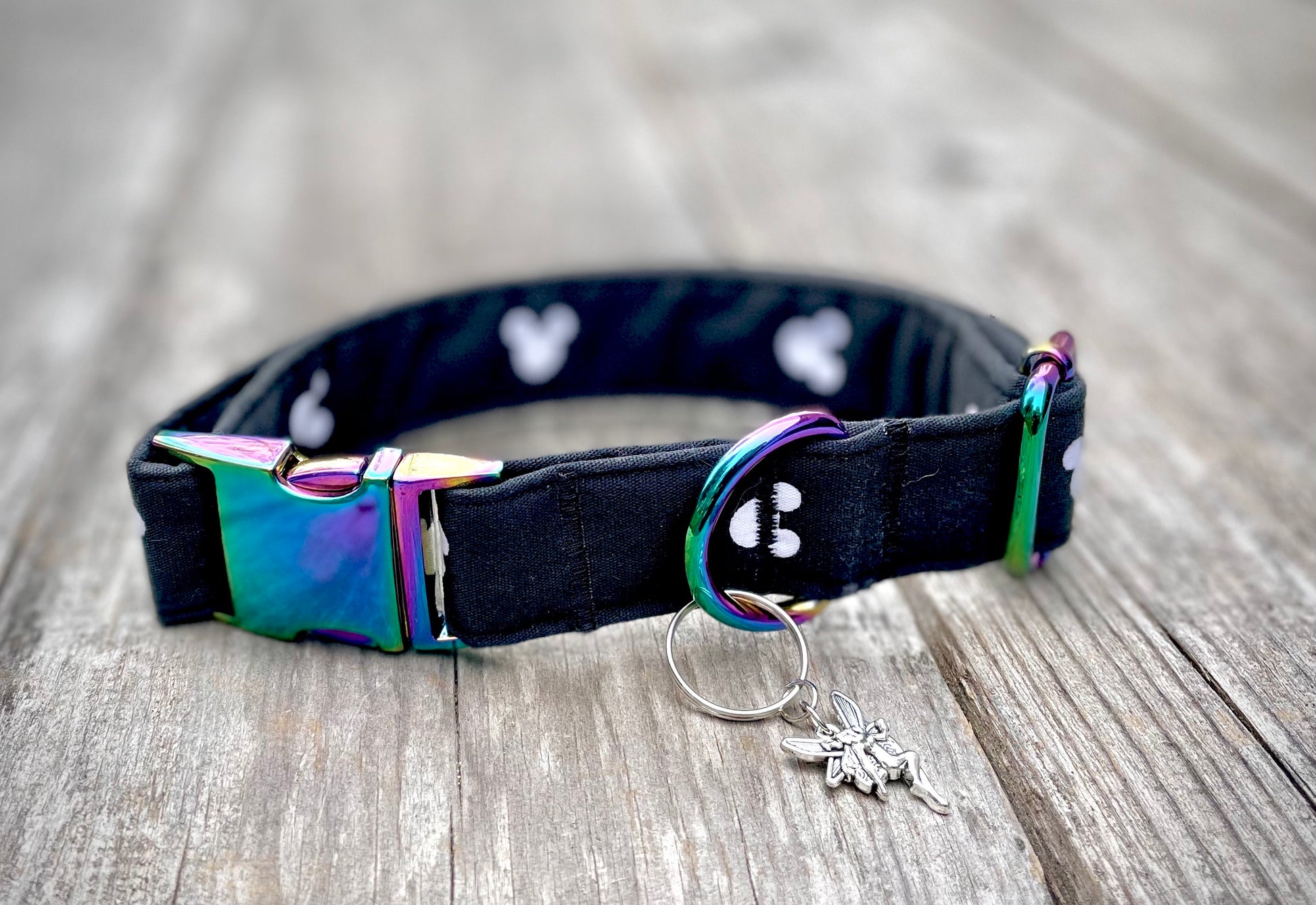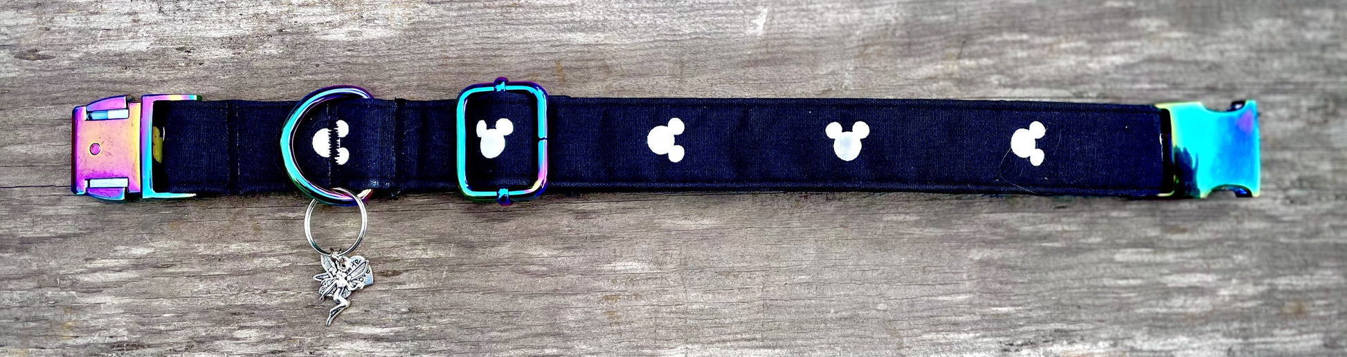 This charming collar is perfect for any Disney or Mickey Mouse lover! This collar is made out of the cutest black fabric that features the oh, so iconic Mickey Mouse silhouette in white. The random placement and orientation of the silhouettes gives off a fun and funky vibe. This collar has a matching leash option, don't forget to check it out! Our leashes are 5-foot long, 1-inch wide, and come with a heavy-duty metal spring-loaded hook that attaches to the D-ring on your pet's collar. Each collar comes with a coordinating charm*. This hand-crafted collar is made with 100% cotton fabric and your choice of a metal or plastic buckle with a matching adjuster. Each collar is made with a reinforced metal D-ring. This elegant collar is sure to last for years.