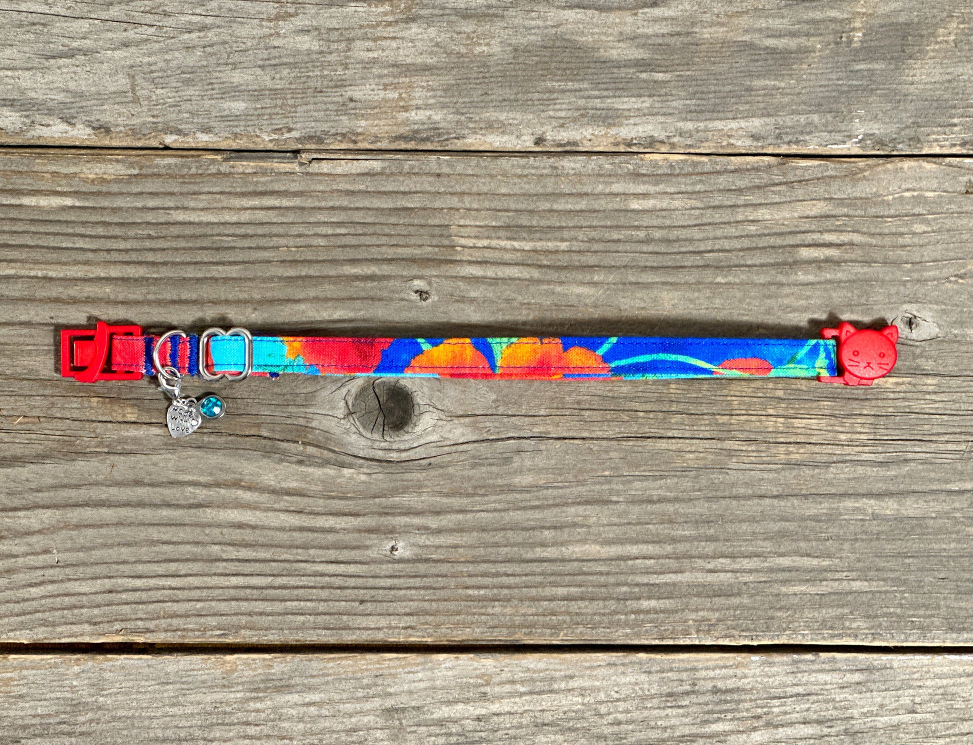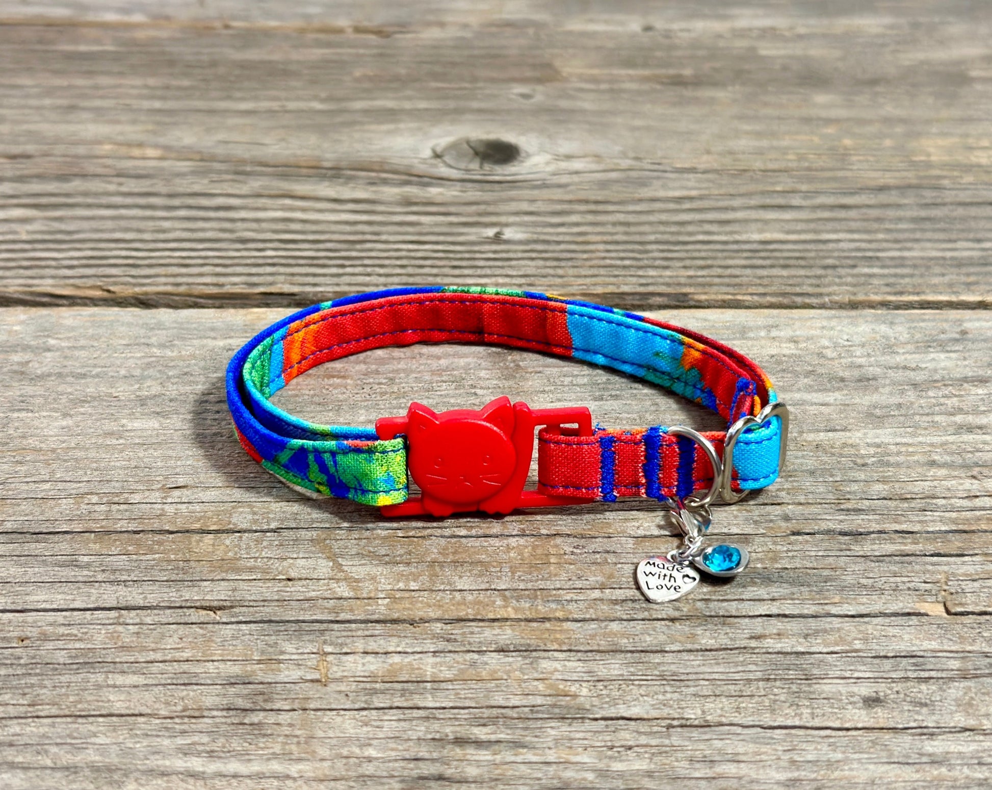 This collar is made out of 100% cotton fabric, making it easy to hand-wash! To wash, simply place it in warm, soapy water and gently rub the fabric. Rinse the collar, then dry it by laying it flat or by hanging it on a wire. If your cat has a little extra fun while wearing this collar, try using a stain-remover pen or spray.