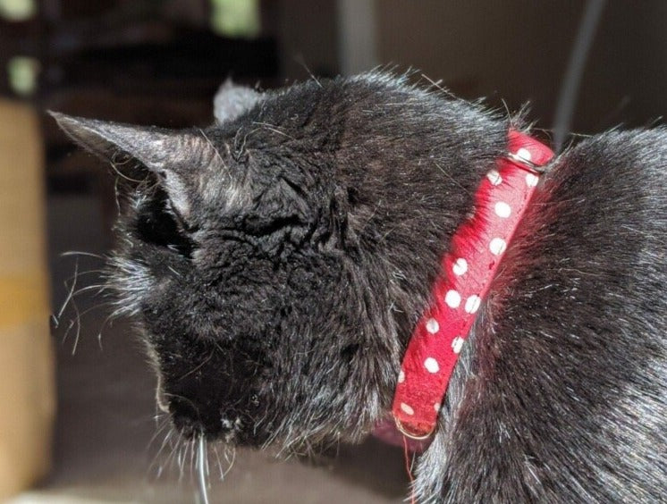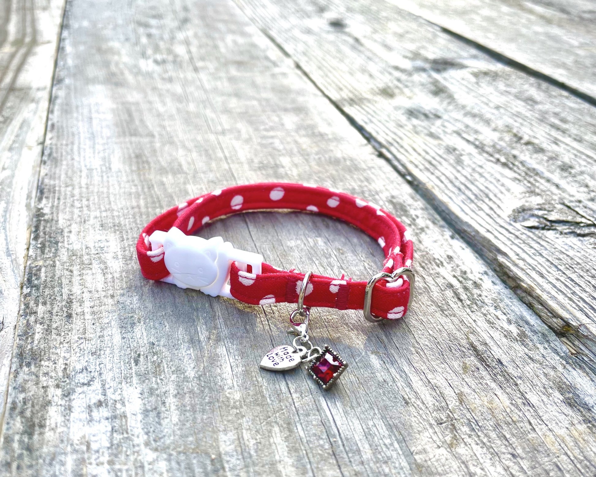 Get your Polka on with this bright, vibrant, happy print! Inspired by our friend, Minnie Mouse, we hope this collar and charm* brings you limitless love and joy. This hand-crafted collar is made with 100% cotton fabric and a breakaway clasp. This elegant collar is sure to last for years.