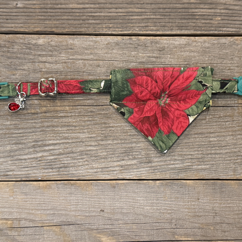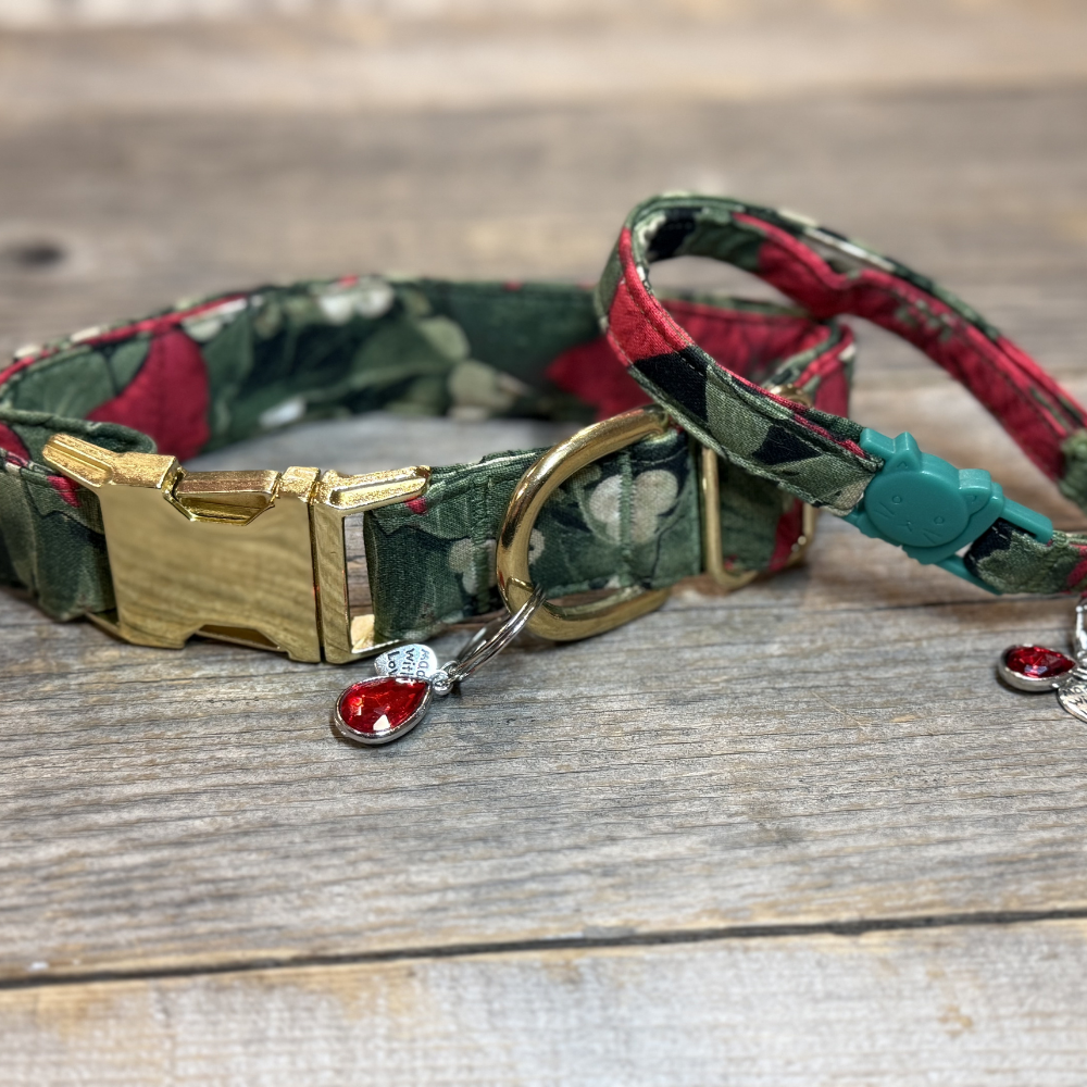 The Crimson Grace Collar is an elegant and timeless beauty of the holiday season. This stunning piece showcases a lush pattern of deep red poinsettias surrounded by rich green holly leaves and delicate white berries, creating a scene straight from a winter wonderland. Perfect for pets who embody the spirit of the holidays, Crimson Grace brings warmth, elegance, and festive charm to every occasion.