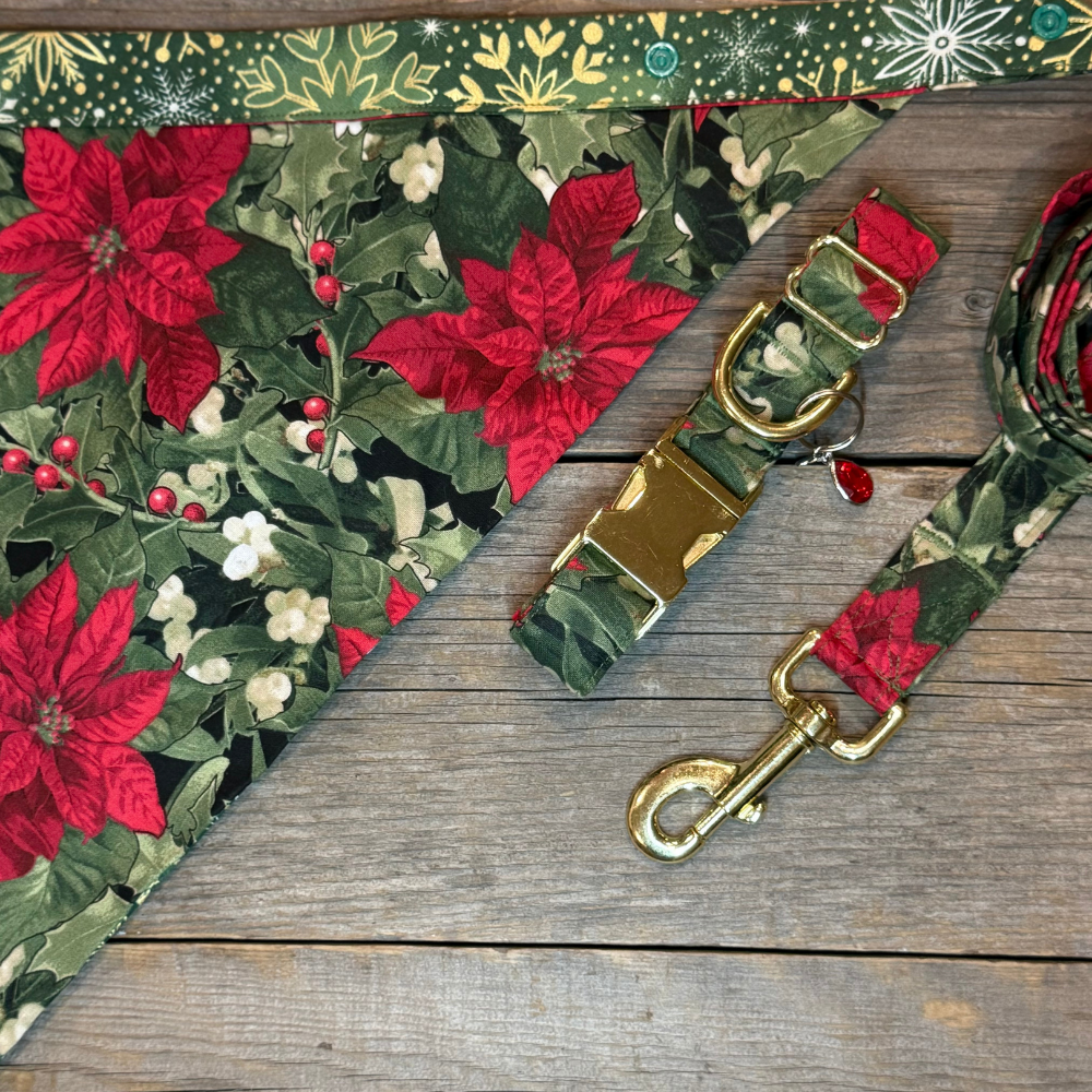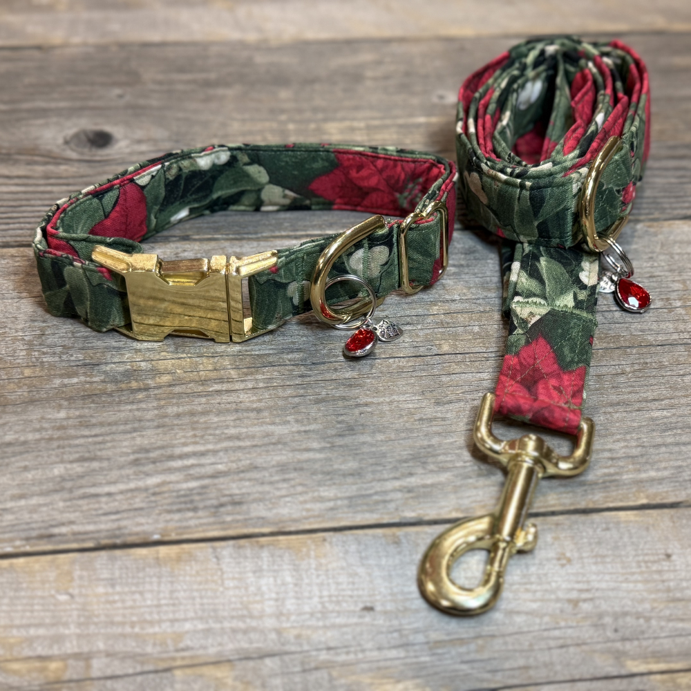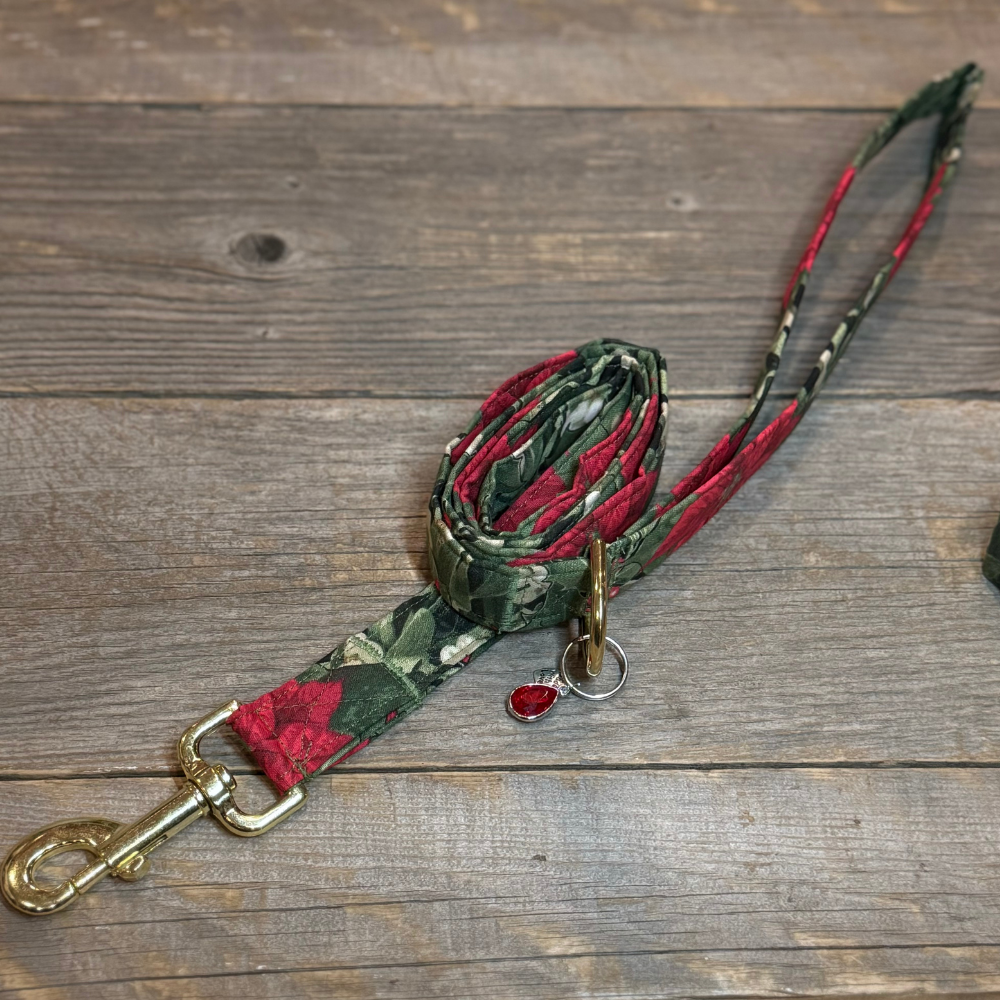 The Crimson Grace leash is an elegant and timeless beauty of the holiday season. This stunning piece showcases a lush pattern of deep red poinsettias surrounded by rich green holly leaves and delicate white berries, creating a scene straight from a winter wonderland. Perfect for pets who embody the spirit of the holidays, Crimson Grace brings warmth, elegance, and festive charm to every occasion.