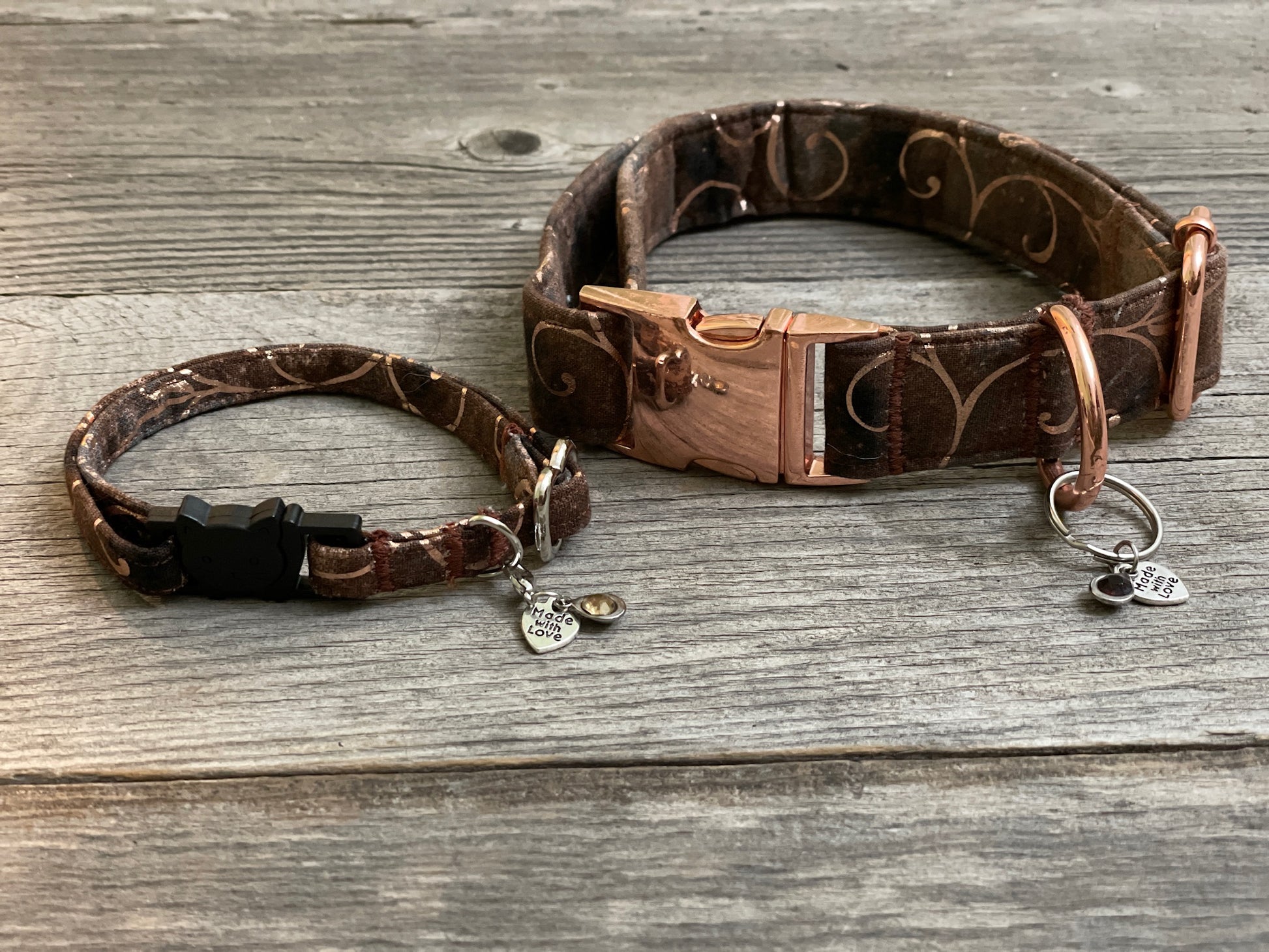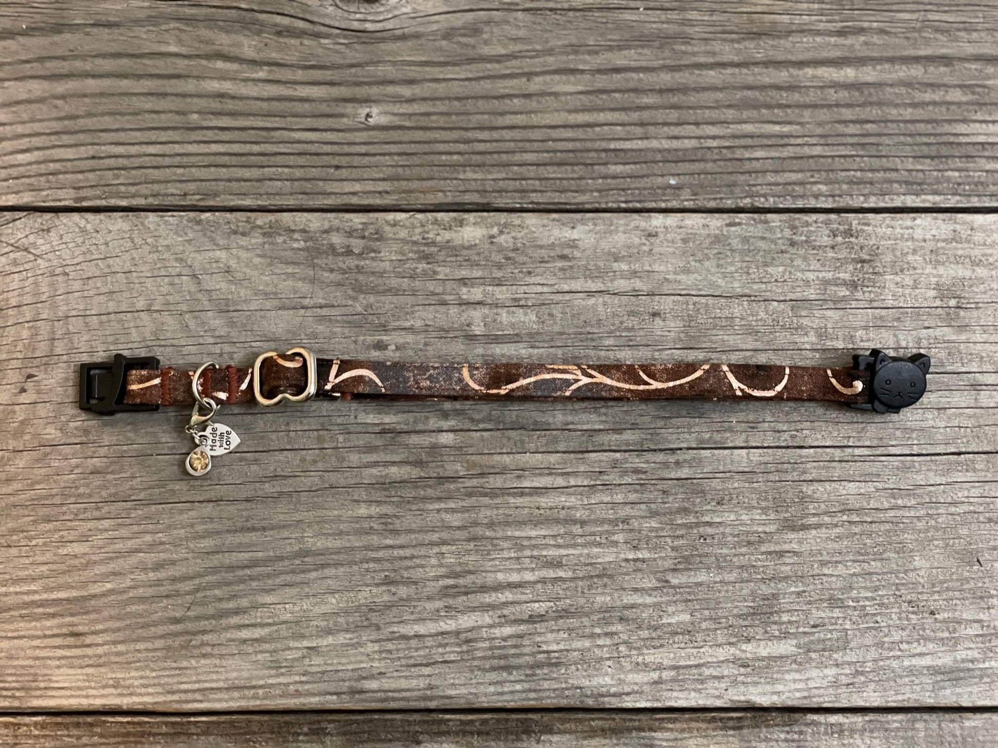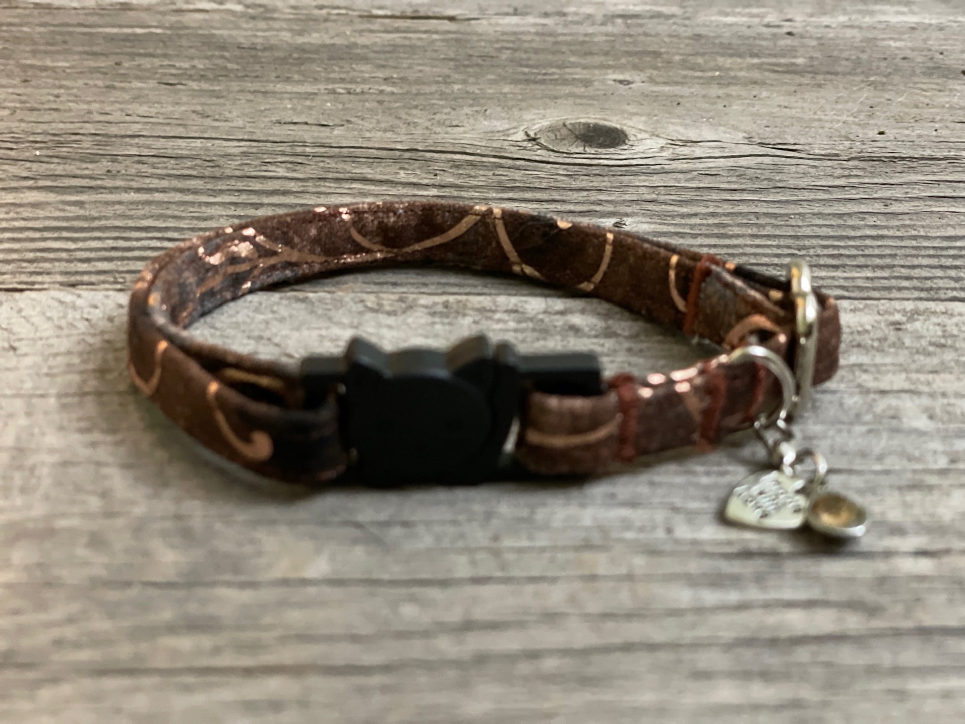 This collar gives you the French-New Orleans vibe. The mixes of light and dark brown, paired with swirls of metallic rose gold dress up any occasion. This is the perfect collar to bring life to any festivity.