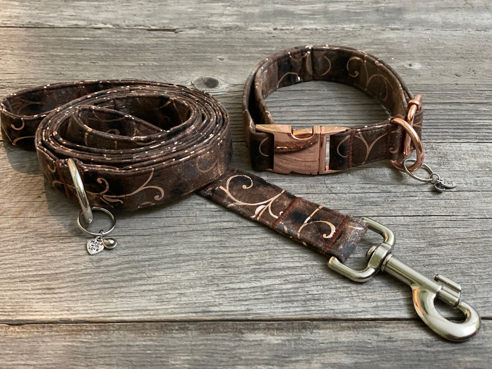 This collar gives you the French-New Orleans vibe. The mixes of light and dark brown, paired with swirls of metallic rose gold dress up any occasion. This is the perfect collar to bring life to any festivity.
