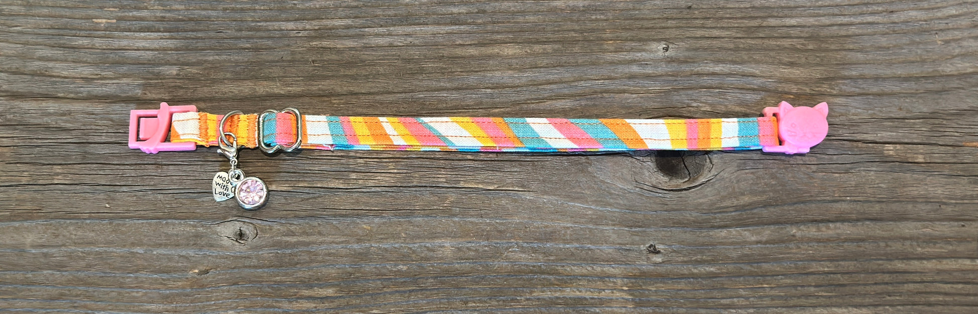 Our cat collars are 3/8" wide and have a plastic breakaway buckle.