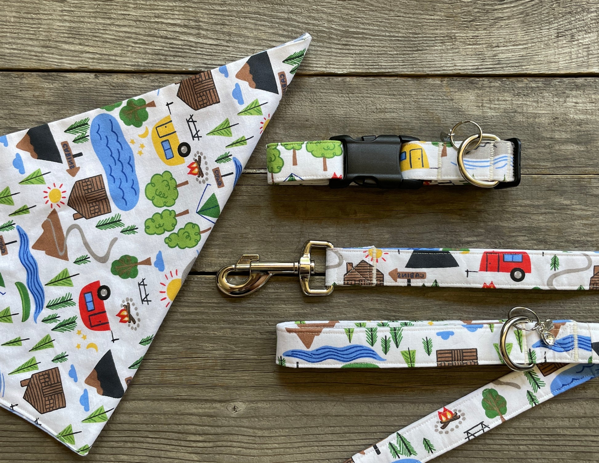 If you just can’t wait to get on the road again, this pattern is perfect for you. The adorable yellow or red campers stand out on the white background. Trees, tents, campsites, and mountains surround the campers giving this fabric an edge of adventure. On the Road Again is perfect when traveling with your pups and friends to places you’ve never been. Every camper needs a bandana, so don’t forget to check this matching one out.