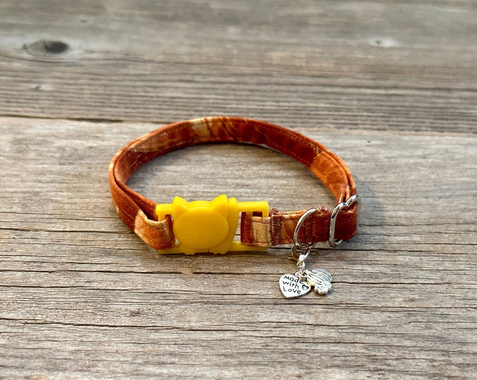 This collar is made out of 100% cotton fabric, making it easy to hand-wash! To wash, simply place it in warm, soapy water and gently rub the fabric. Rinse the collar, then dry it by laying it flat or by hanging it on a wire. If your cat has a little extra fun while wearing this collar, try using a stain-remover pen or spray.