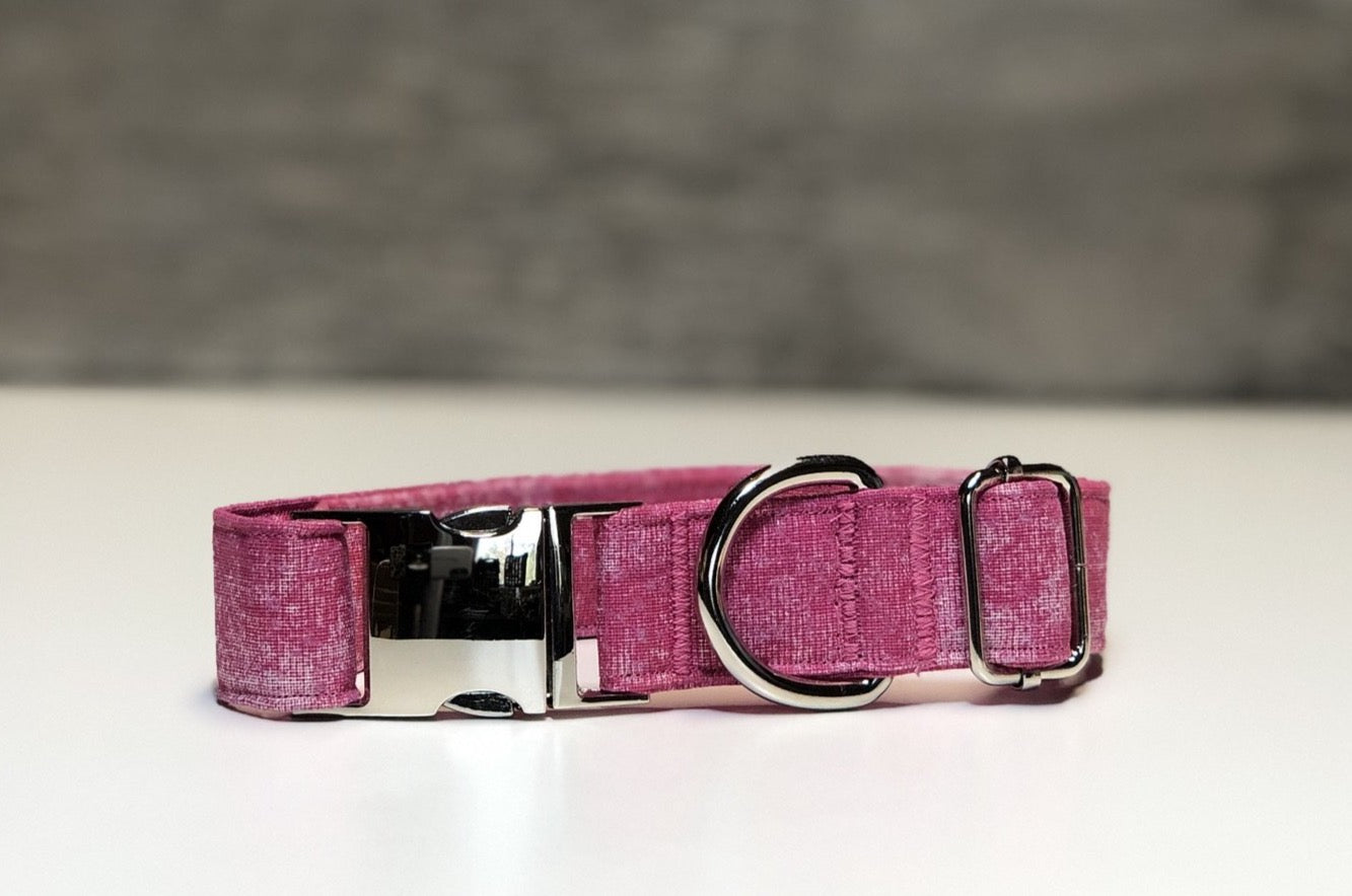 Nothing is cooler than pink! Your pet can be a part of The Pinkettes with this adorable collar. This vibrant collar features sporadic splotches of hot pink, peach, white, and plumb. Each collar comes with a coordinating charm*. This hand-crafted collar is made with 100% cotton fabric and your choice of a metal or plastic buckle with a matching adjuster. Each collar is made with a reinforced metal D-ring. This elegant collar is sure to last for years.