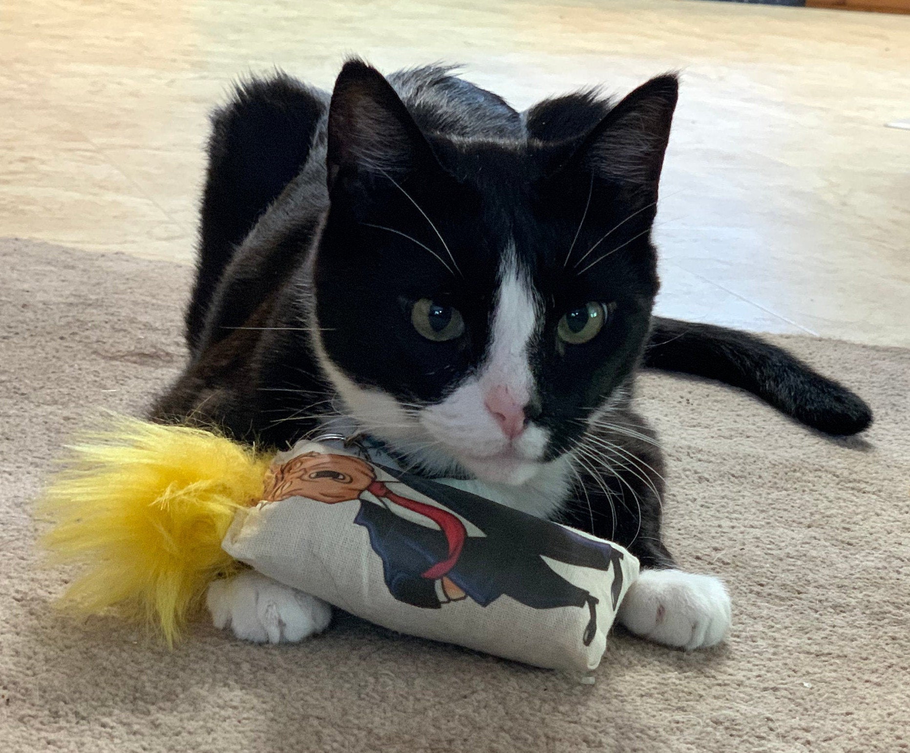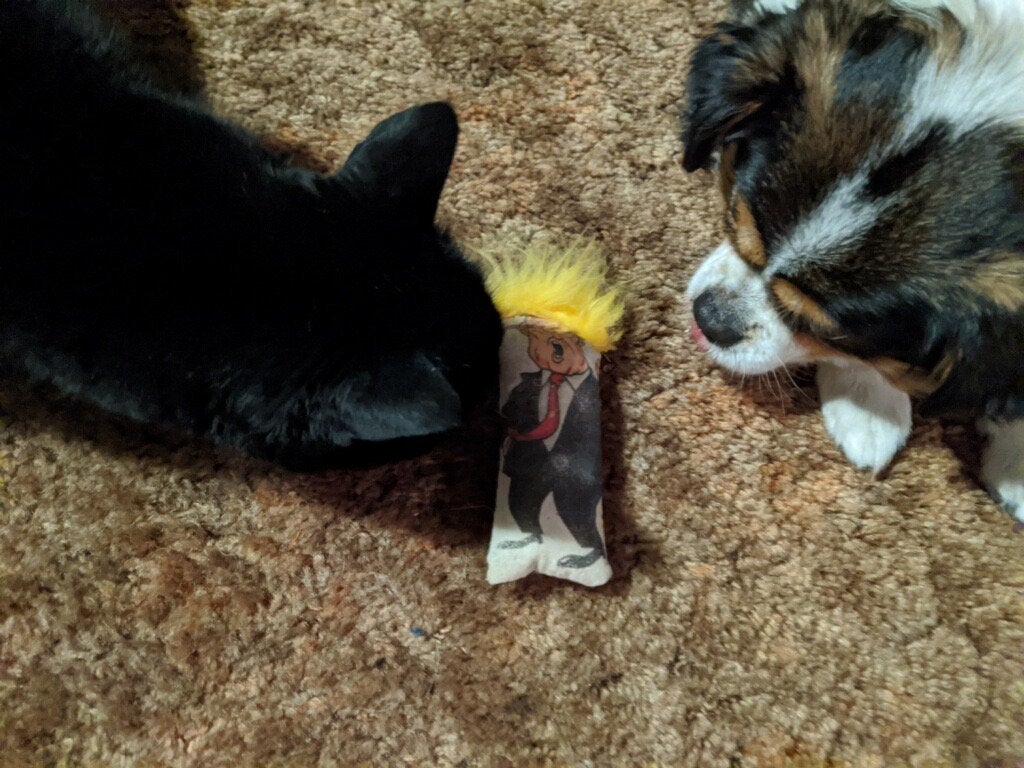 No matter how you’re feline about our president, your cat will get a kick out of this catnip-filled novelty toy. This toy is made out of sturdy canvas, filled with batting and organic catnip, and covefed with orange hair to ensure your fur-baby has endless fun. Comes in one bigly size. For an extra bargain order the Political Pack for only $8.50 more! The Political Pack adds an additional kitty kicker that features both symbols of the Democratic and Republican parties on a cream background. Two kickers are always more fun than one!