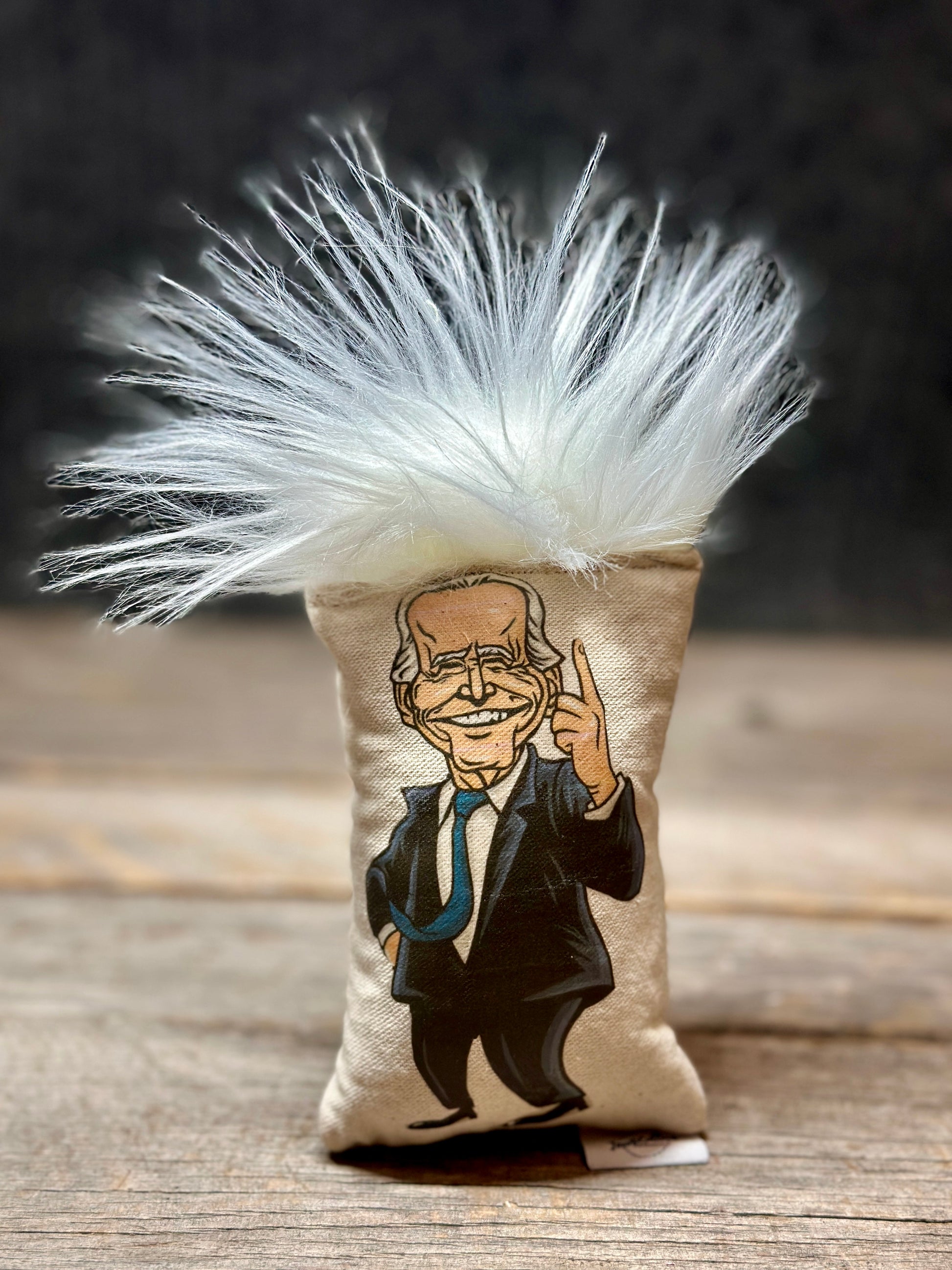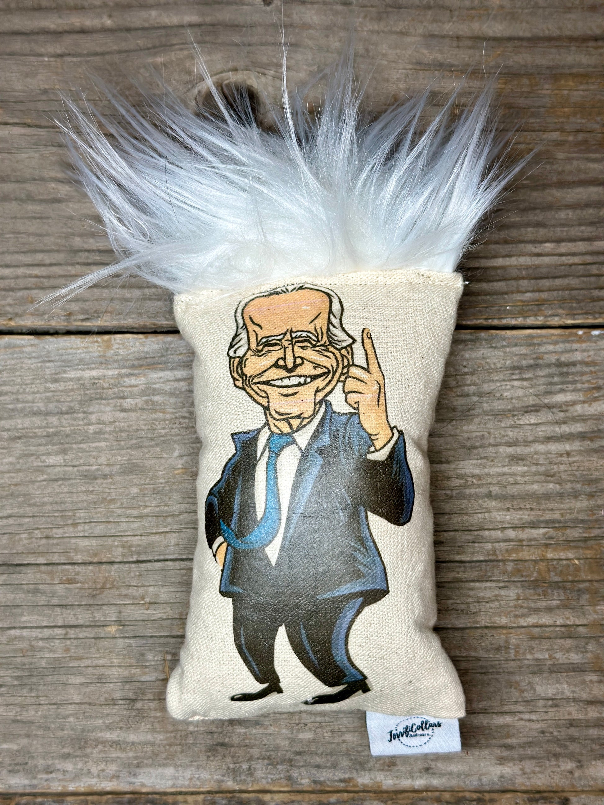 No matter how you’re feline about our president, your cat will get a kick out of this catnip-filled novelty toy. This toy is made out of sturdy canvas, filled with batting and organic catnip, and covered with white hair to ensure your fur-baby has endless fun. Comes in one large size. For an extra bargain order the Political Pack for only $8.50 more! The Political Pack adds an additional kitty kicker that features both symbols of the Democratic and Republican parties on a cream background. Two kickers are always more fun than one!