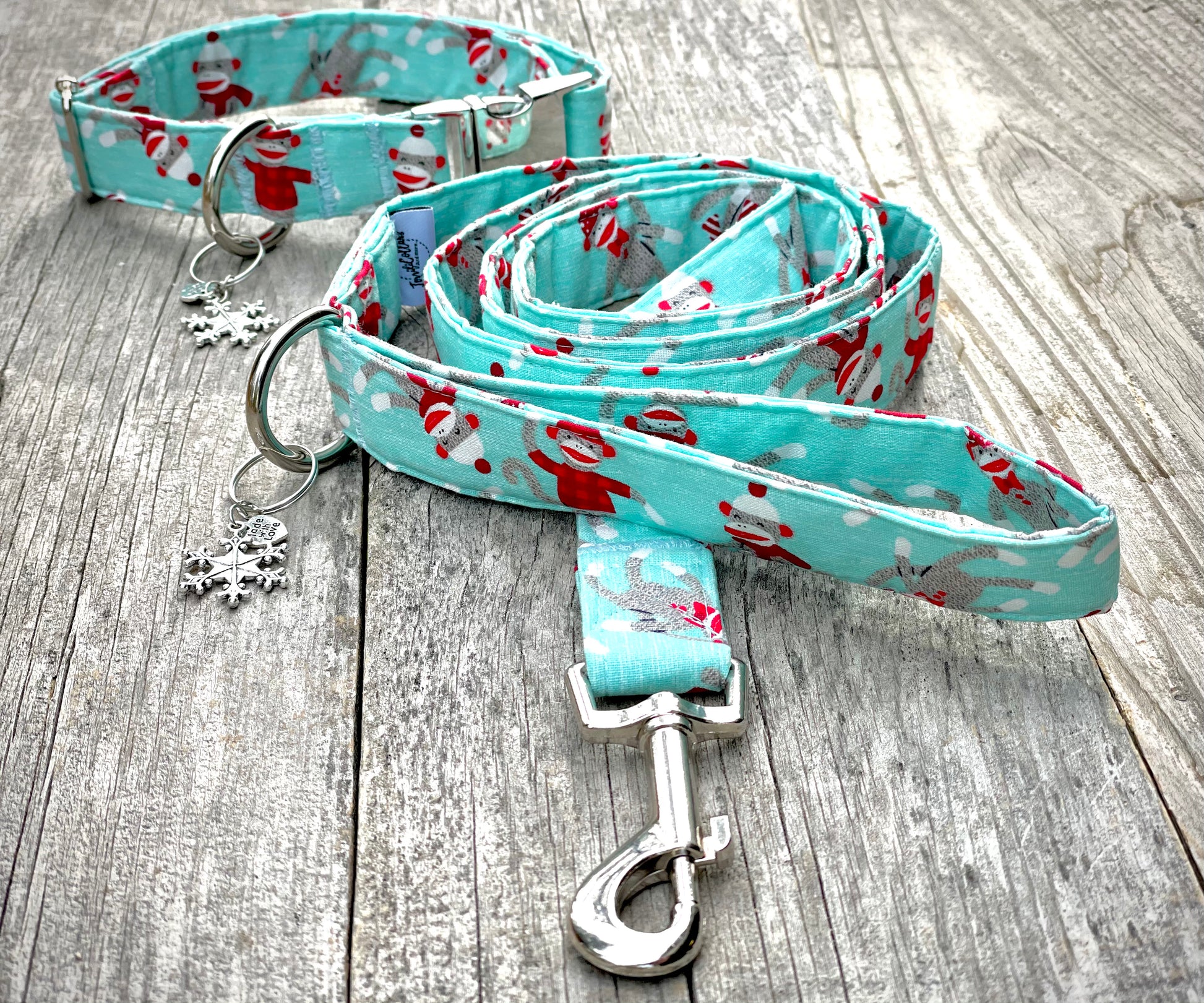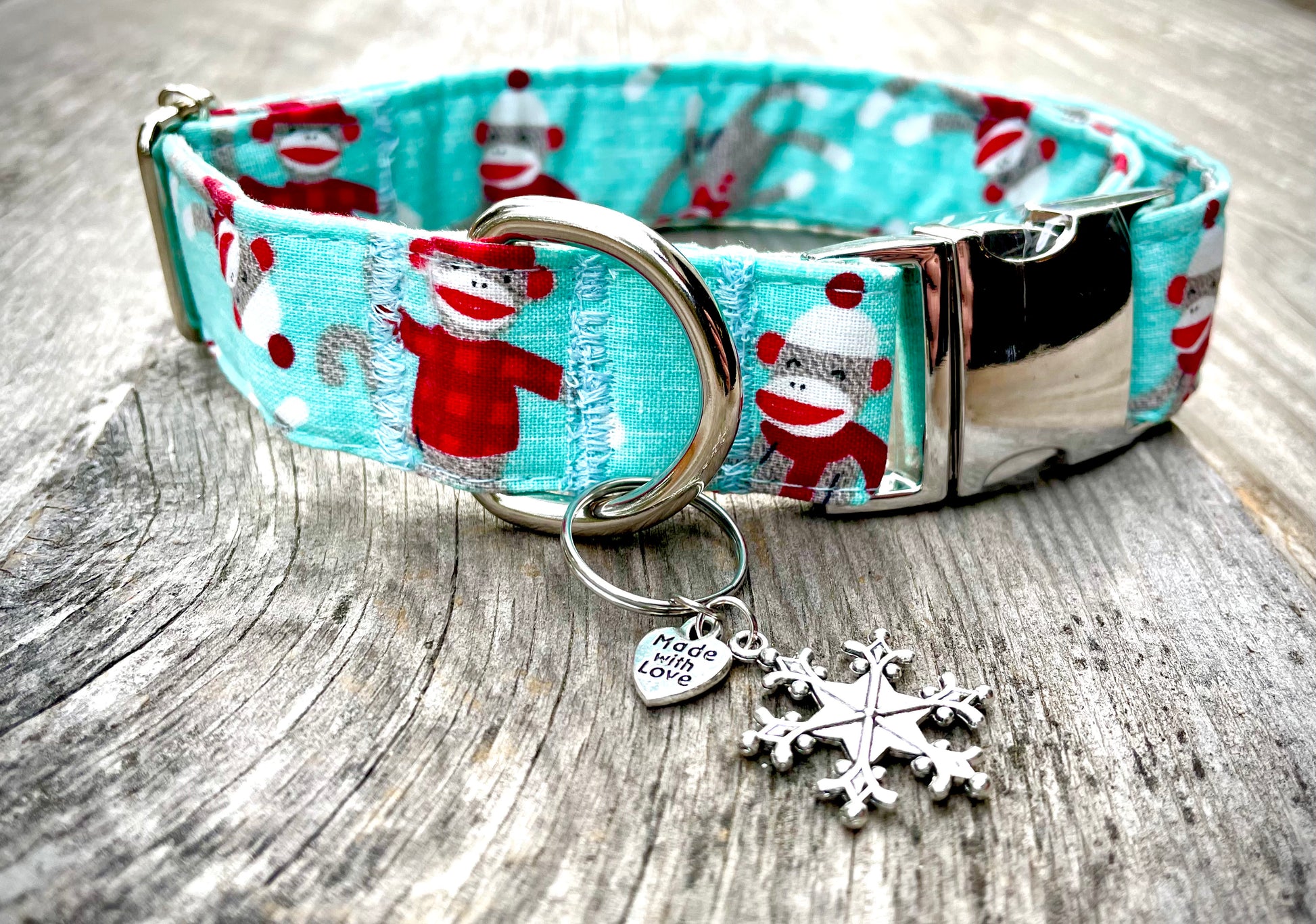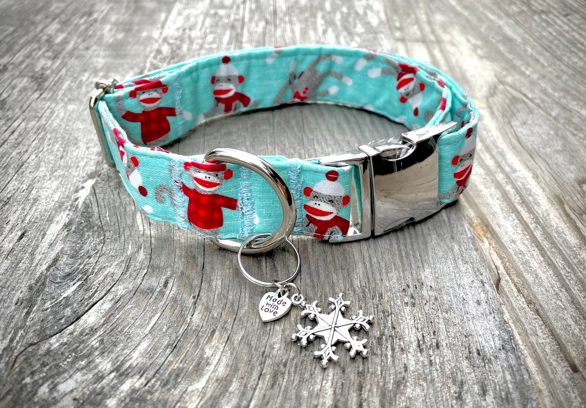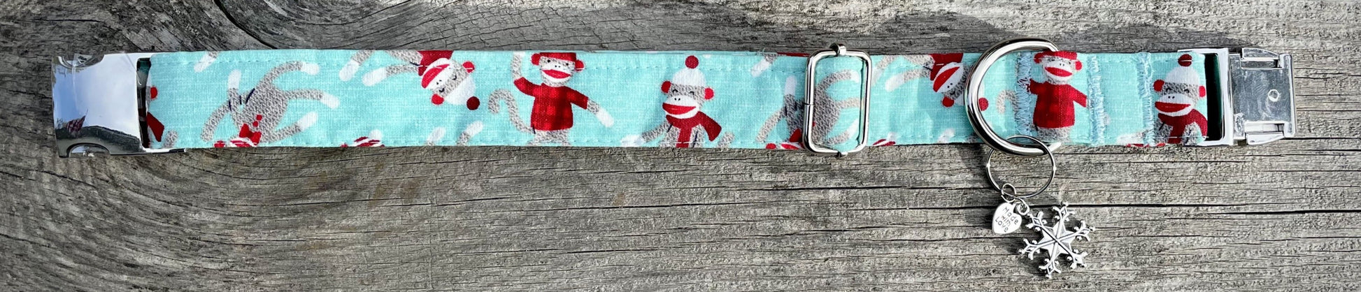 Be part of the Sock Monkey gang with this adorable collar, featuring grey Sock Monkeys wearing bright red hats. The contrast of the fun Sock Monkeys with the bright aqua background will be striking on your best friend. This collar has a matching leash option, don't forget to check it out! Our leashes are 5-foot long, 1-inch wide, and come with a heavy-duty metal spring-loaded hook that attaches to the D-ring on your pet's collar. Each collar comes with a coordinating charm*. This hand-crafted collar is made with 100% cotton fabric and your choice of a metal or plastic buckle with a matching adjuster. Each collar is made with a reinforced metal D-ring. This elegant collar is sure to last for years.