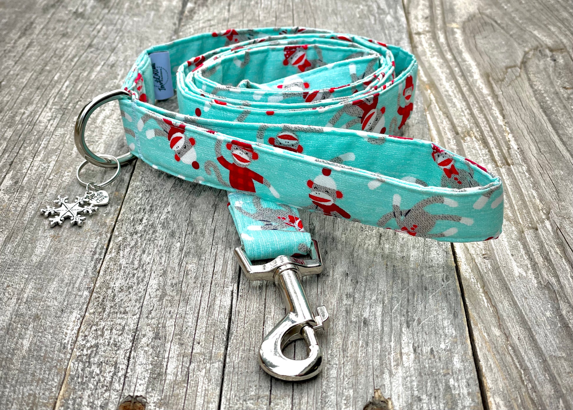 Be part of the Sock Monkey gang with this adorable leash, featuring grey Sock Monkeys wearing bright red hats. The contrast of the fun Sock Monkeys with the bright aqua background will be striking on your best friend. We offer a matching collar to this leash, so don't forget to check it out! All our collars are 1-inch wide and adjustable. We offer small, medium, and large, but are happy to make custom sizes, just send us an email at terrificollars@gmail.com.