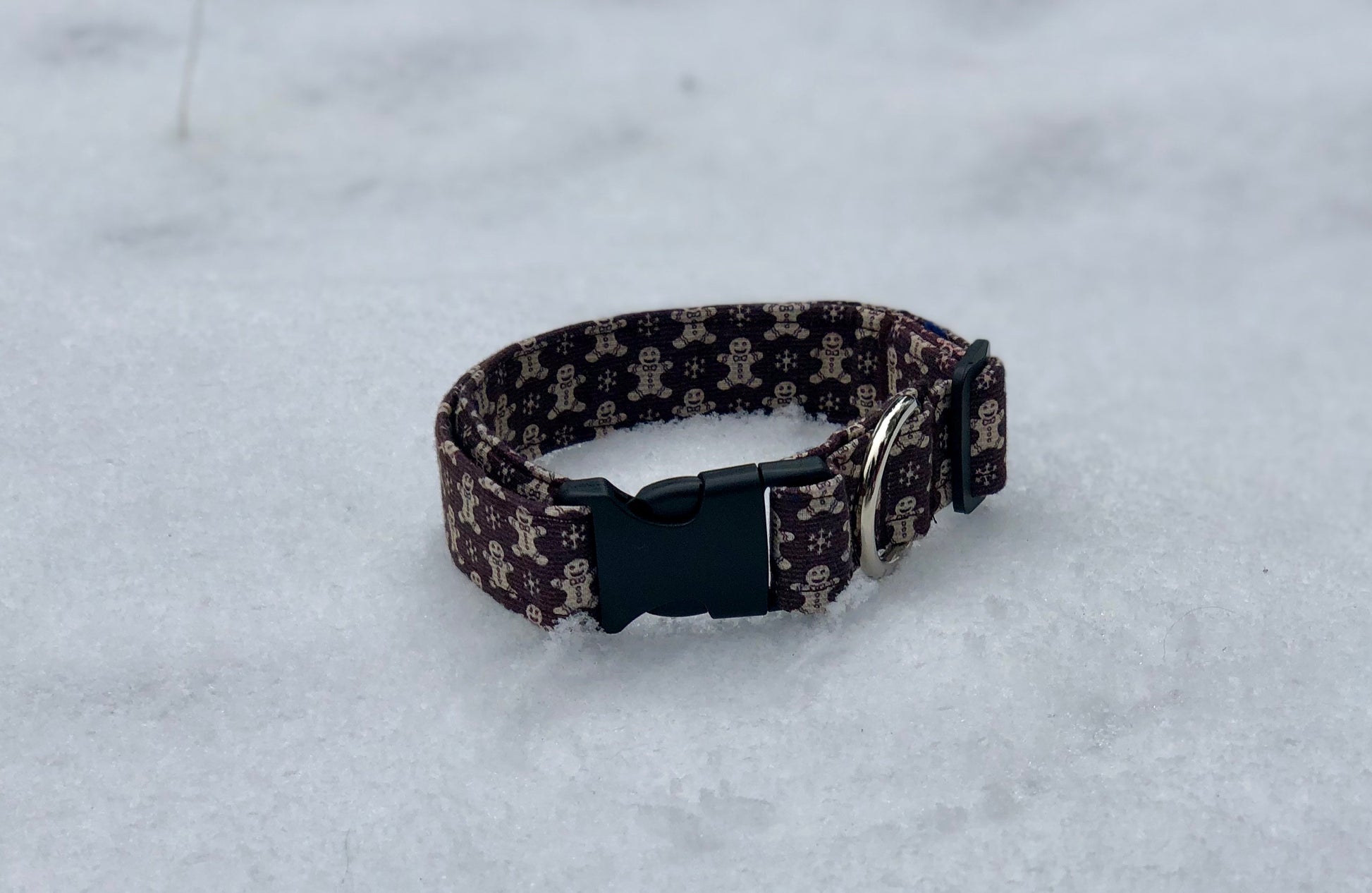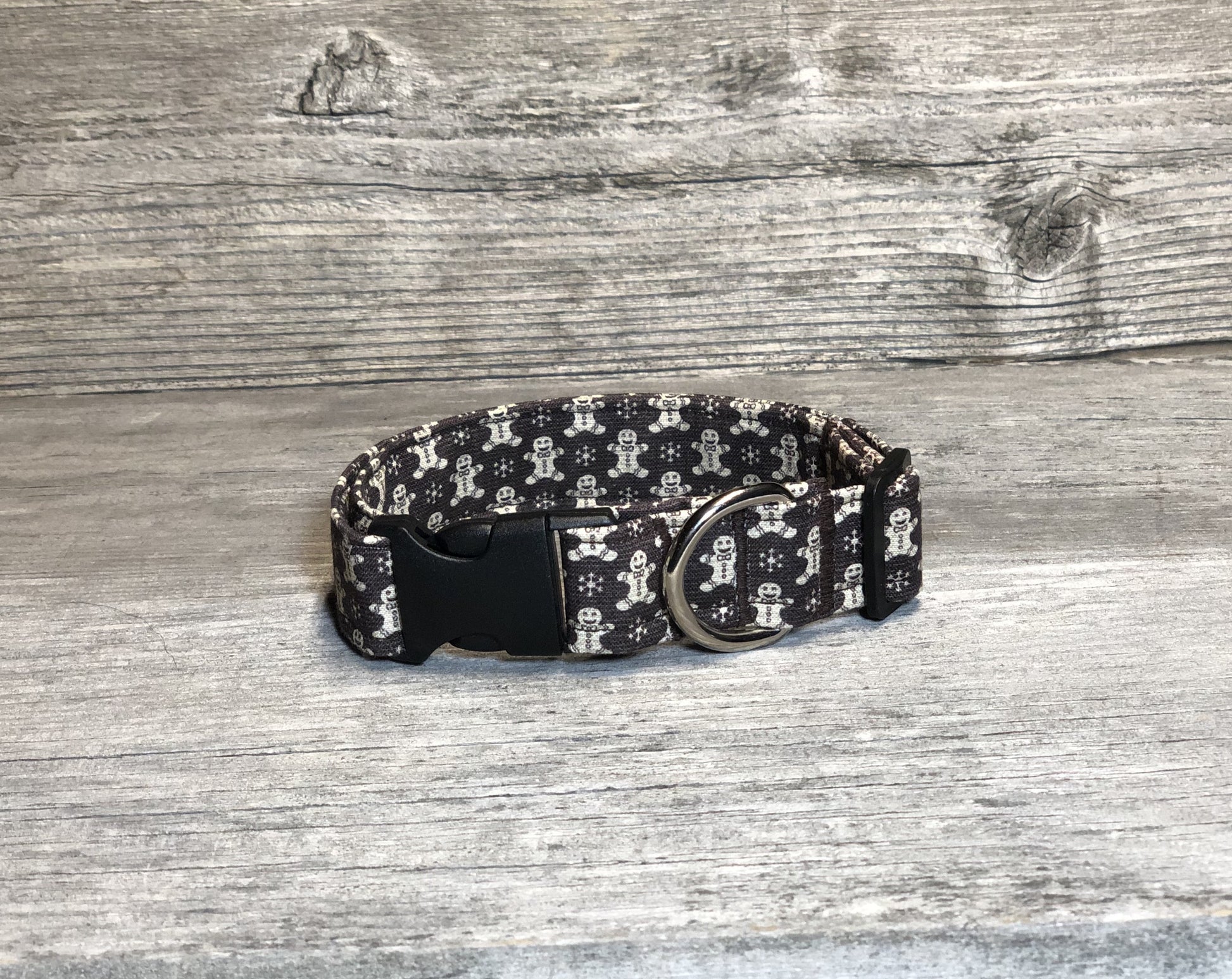 Sugar and spice makes this collar nice. You’ll love the cute gingerbread men and snowflakes on their mocha background. You can’t help but be in the holiday spirit while wearing this collar. Each collar comes with a coordinating charm*. This hand-crafted collar is made with 100% cotton fabric and your choice of a metal or plastic buckle with a matching adjuster. Each collar is made with a reinforced metal D-ring. This elegant collar is sure to last for years.