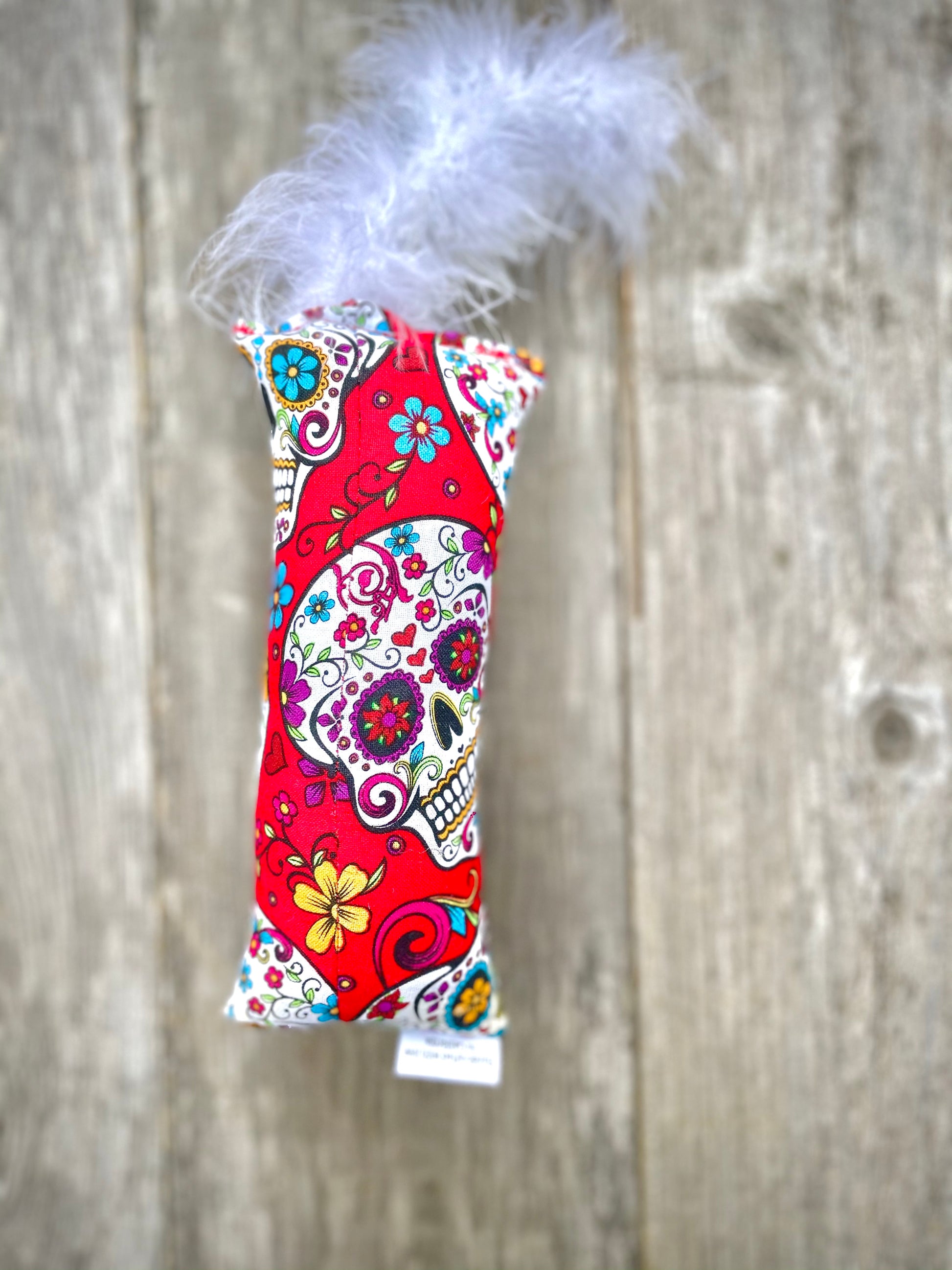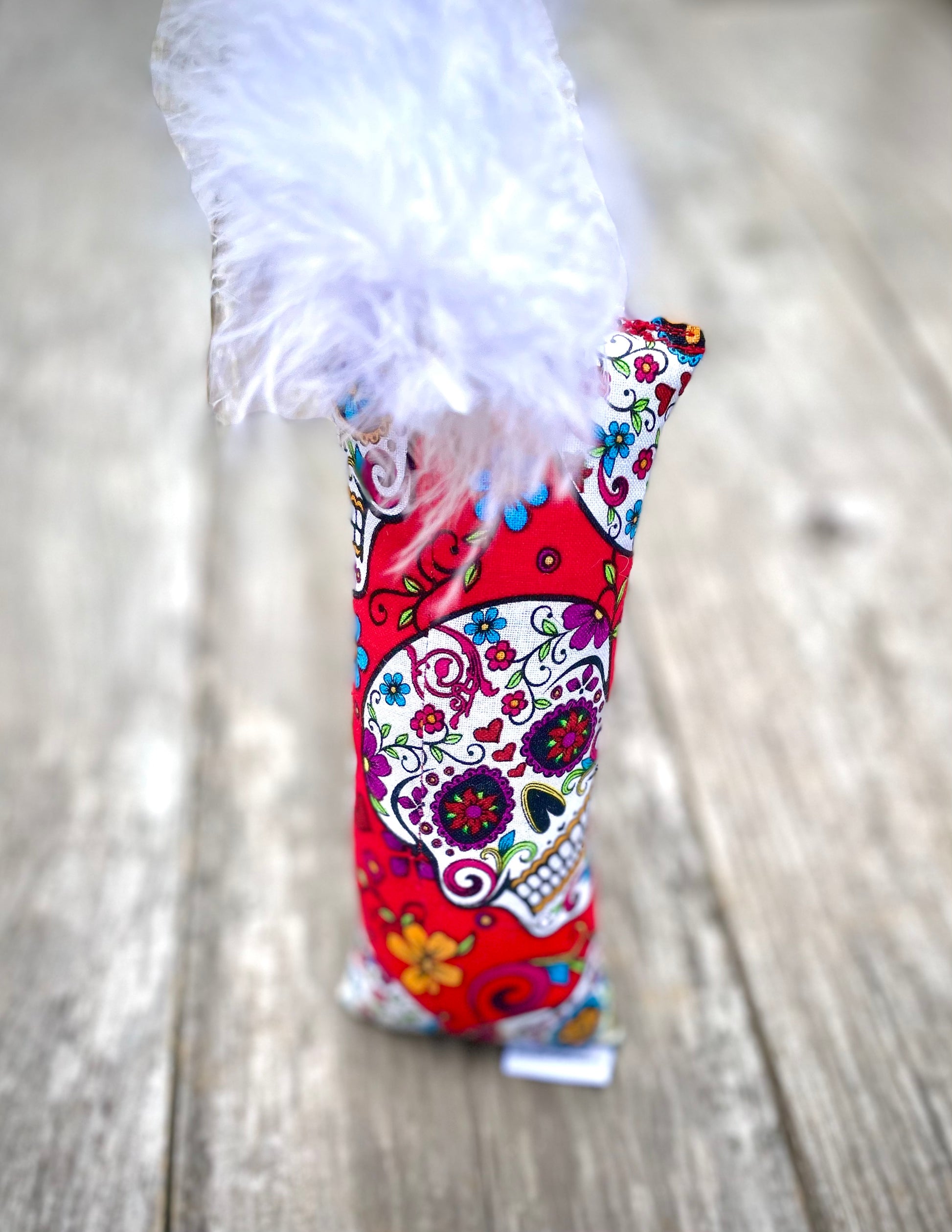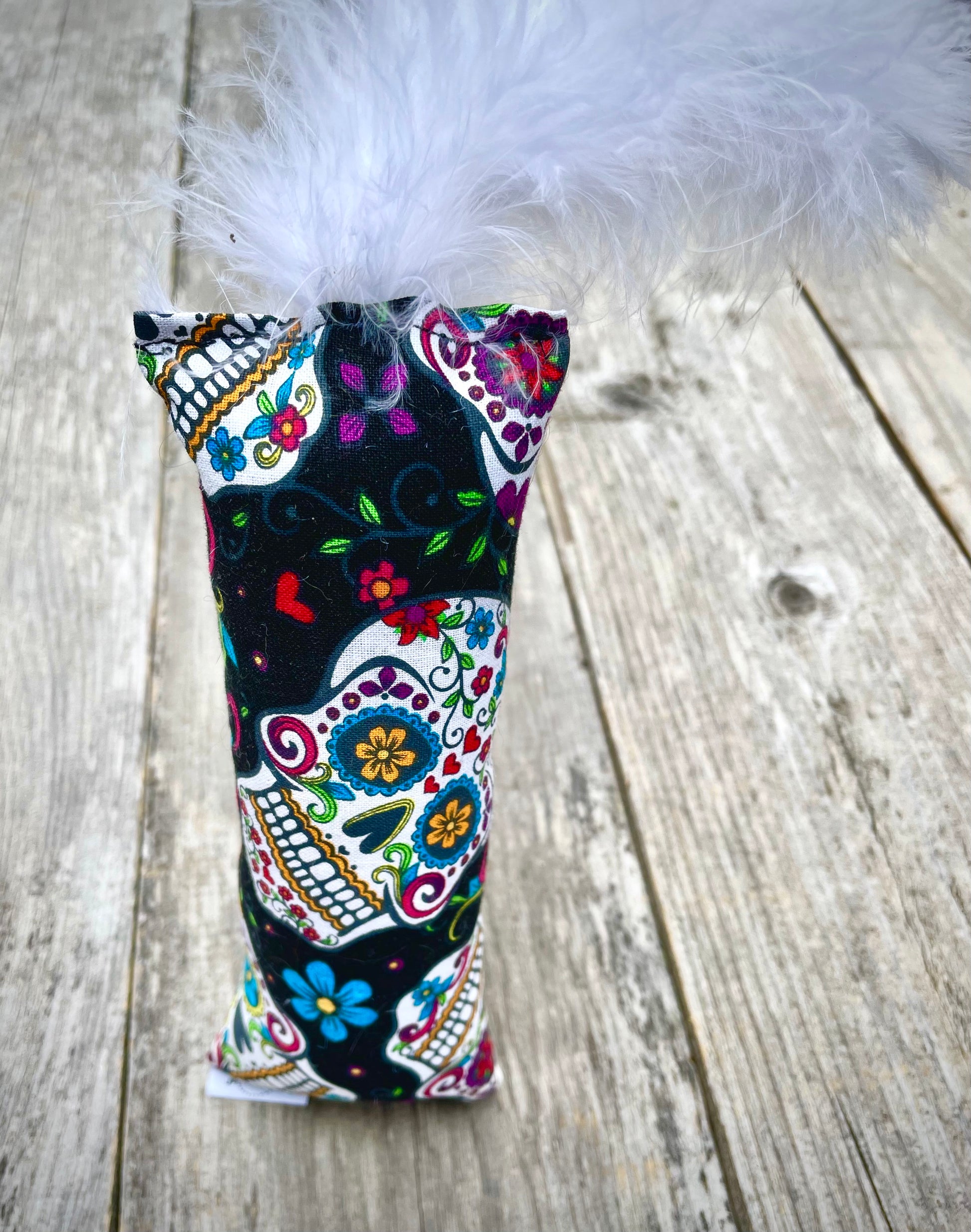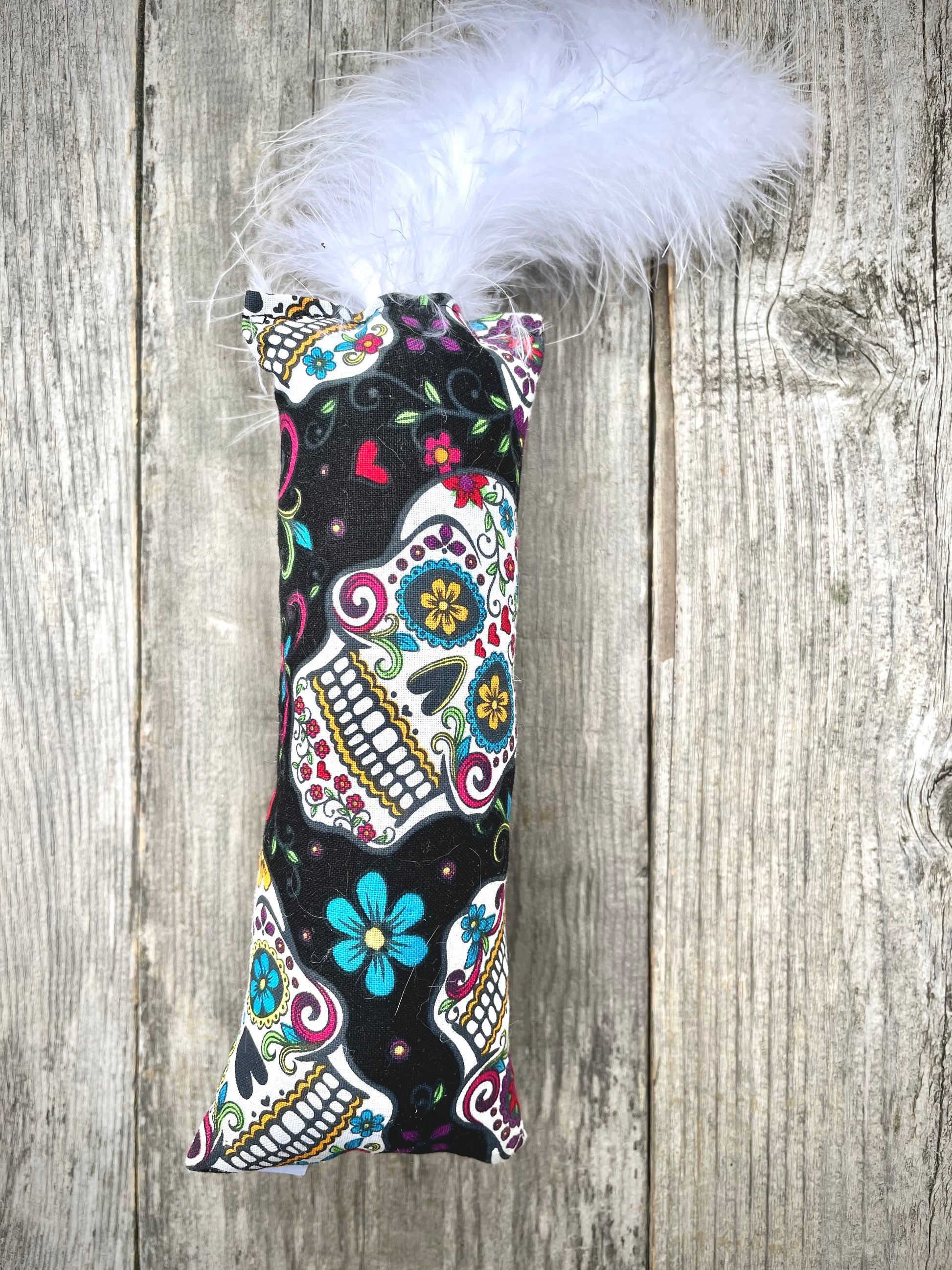 This kicker is perfect for anyone who loves sugar skulls. This beautiful fabric is available in both a red and black option. It is made with cotton fabric and has feathers on the top to ensure extra fun!
