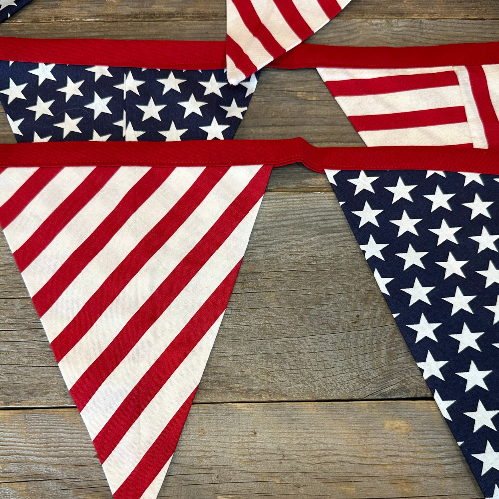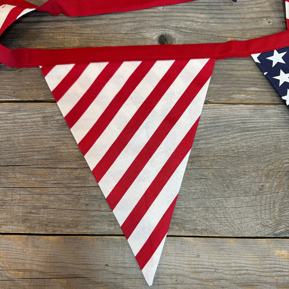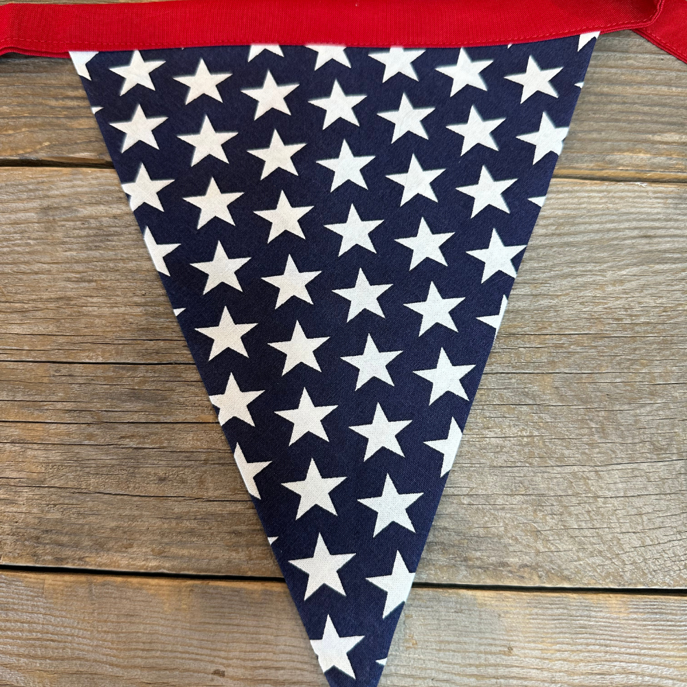 This banner is embellished with broad stripes and bright stars. Whether displayed proudly at home, during festive gatherings, or as a heartfelt gift, this banner stands as an enduring reminder of our nation’s strength. You’ll love the timeless feel of the pendants made of red and white stripes paired with bright white stars on a deep blue background. Total length is 12 feet. It can be hung on a fireplace mantel, stairs, outside, or inside! This is the perfect addition to your next celebration or camping trip. Don't miss out on the opportunity to add a touch of patriotic to your next event. It will surely get tons of compliments, and as an added benefit, it will be reusable and washable for years to come! (When we hang this in our home, everyone who comes over wants one... so be careful when you hang yours!)