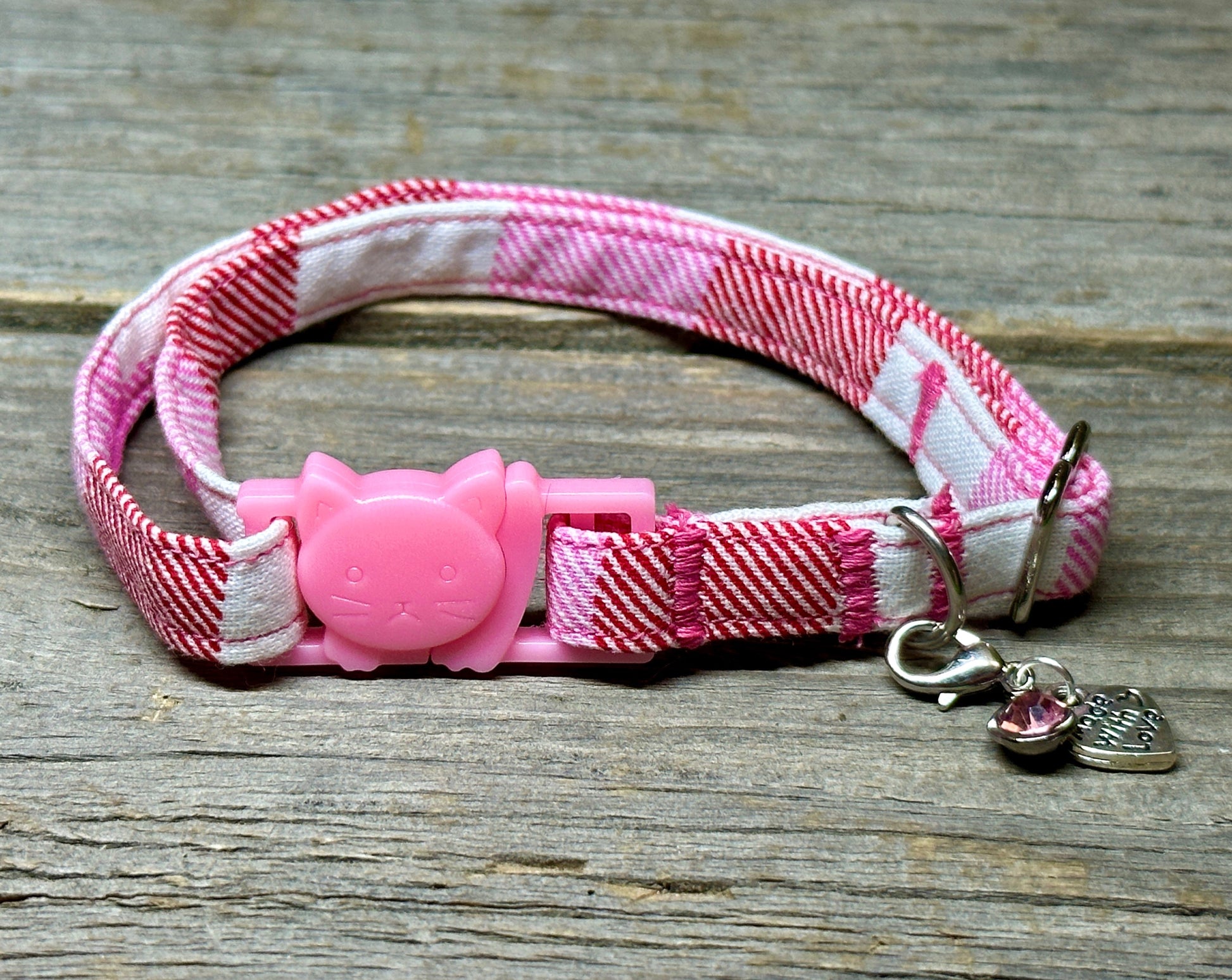 Our cat collars are 3/8" wide and have a plastic breakaway buckle.