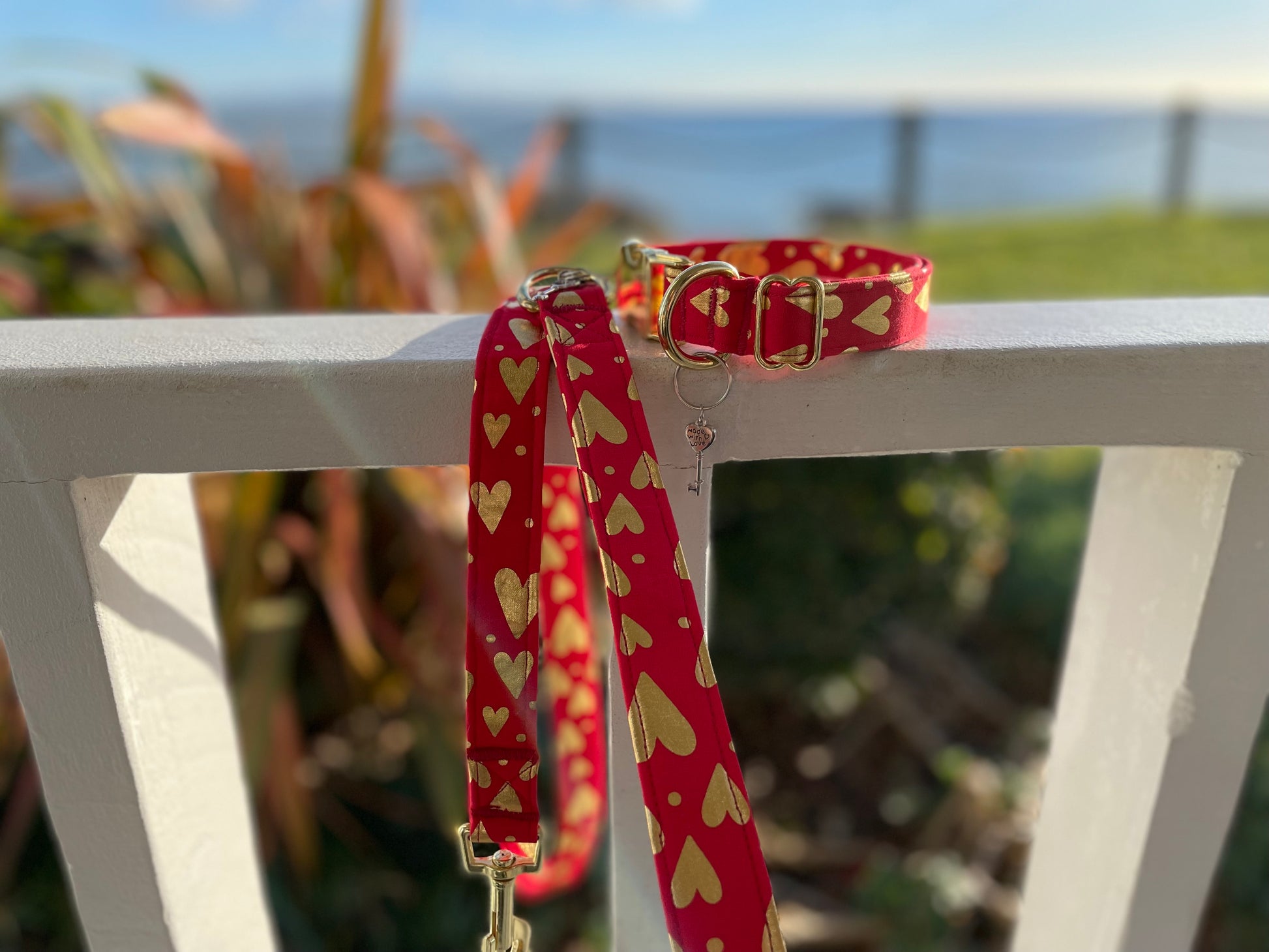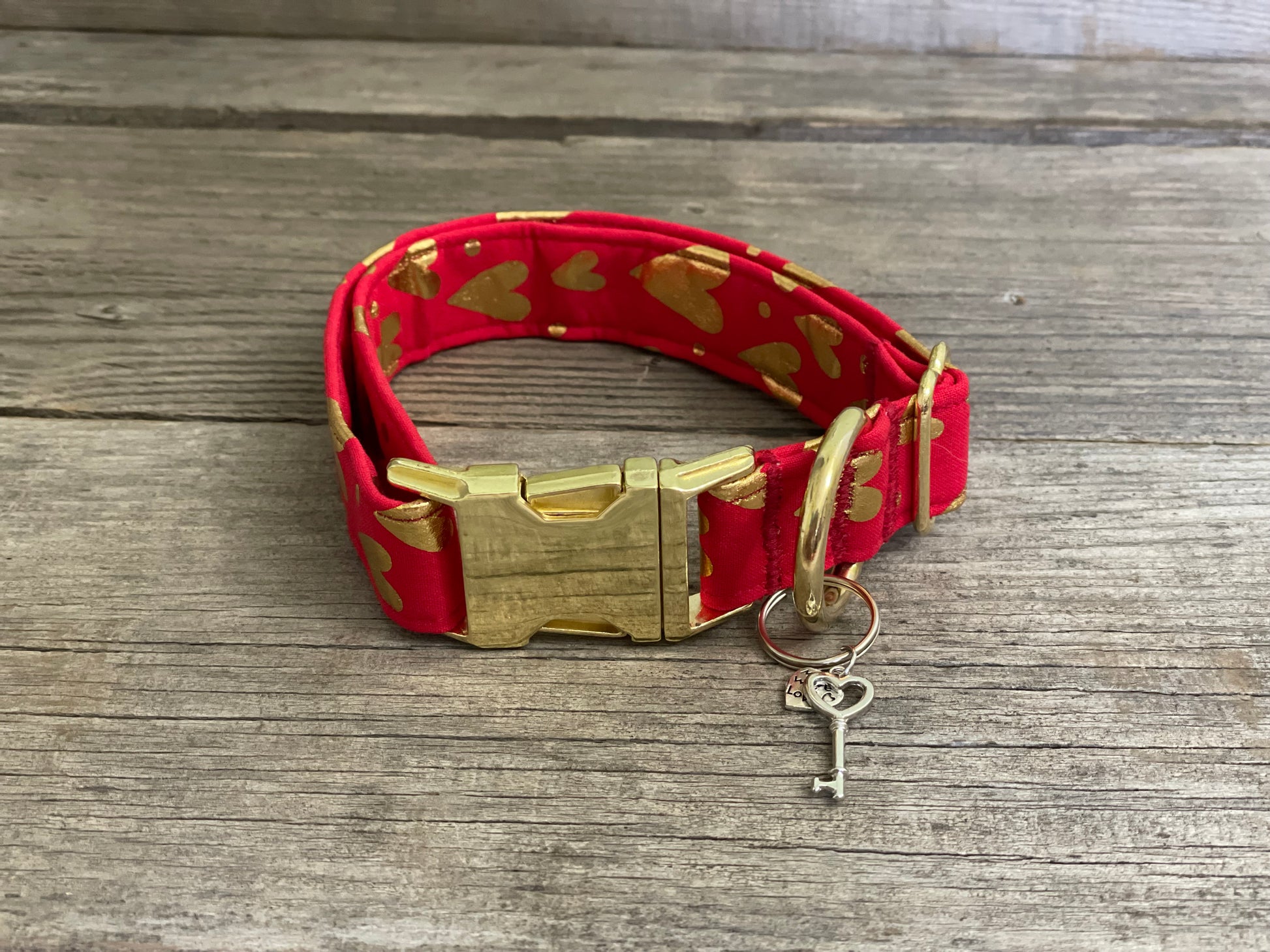 This sweet vibrant collar is sure to get any conversation started. This collar is a flawless mix of small and large metallic golden hearts with little polka dots on a flamboyant red background. Your pup will rock this collar anywhere they go and they are sure to capture hearts.