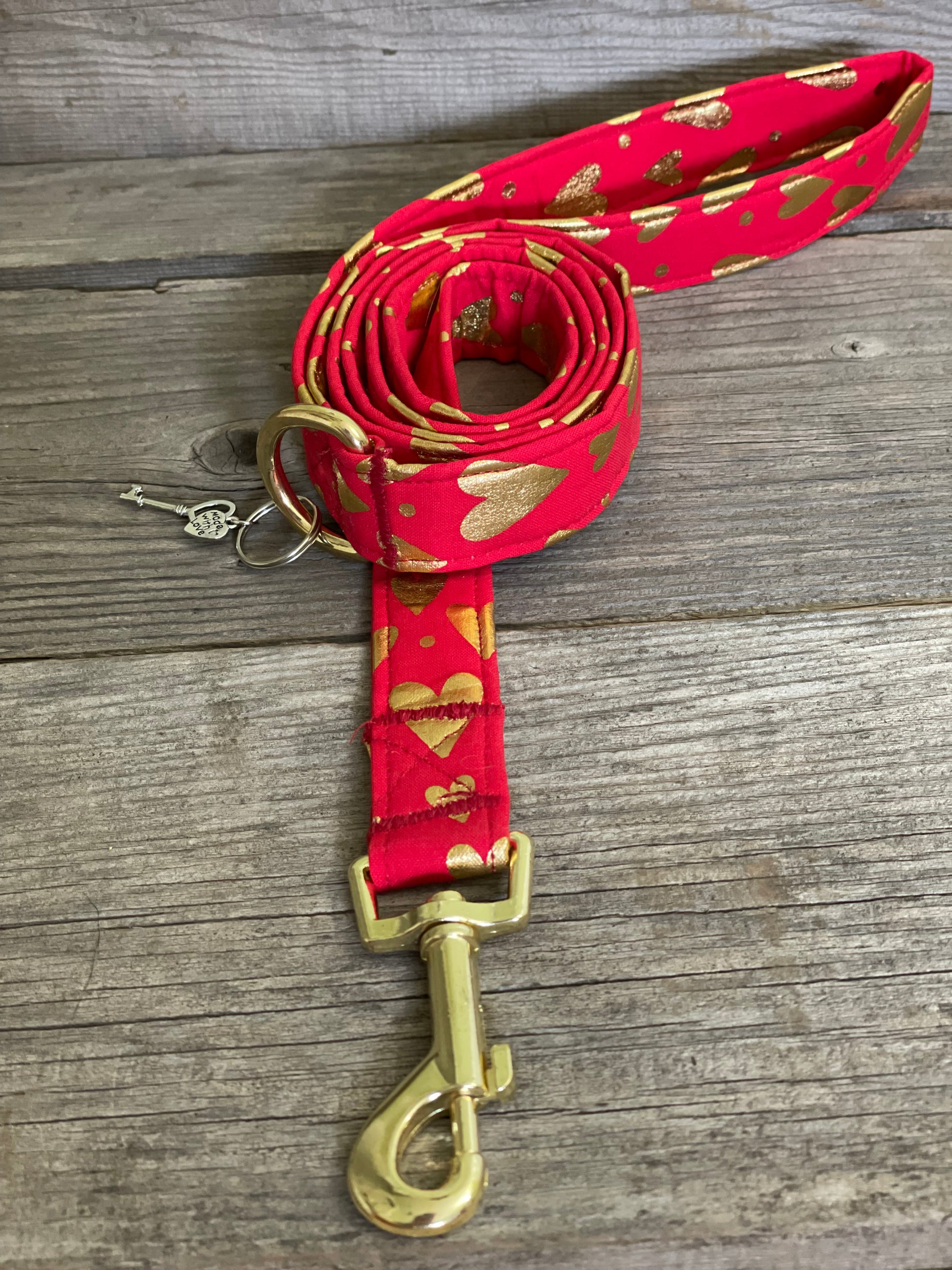 This sweet vibrant collar is sure to get any conversation started. This collar is a flawless mix of small and large metallic golden hearts with little polka dots on a flamboyant red background. Your pup will rock this collar anywhere they go and they are sure to capture hearts.