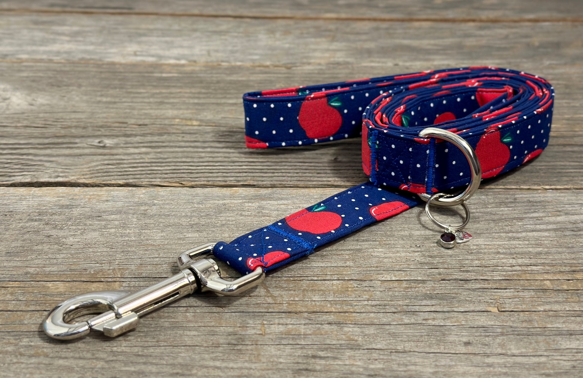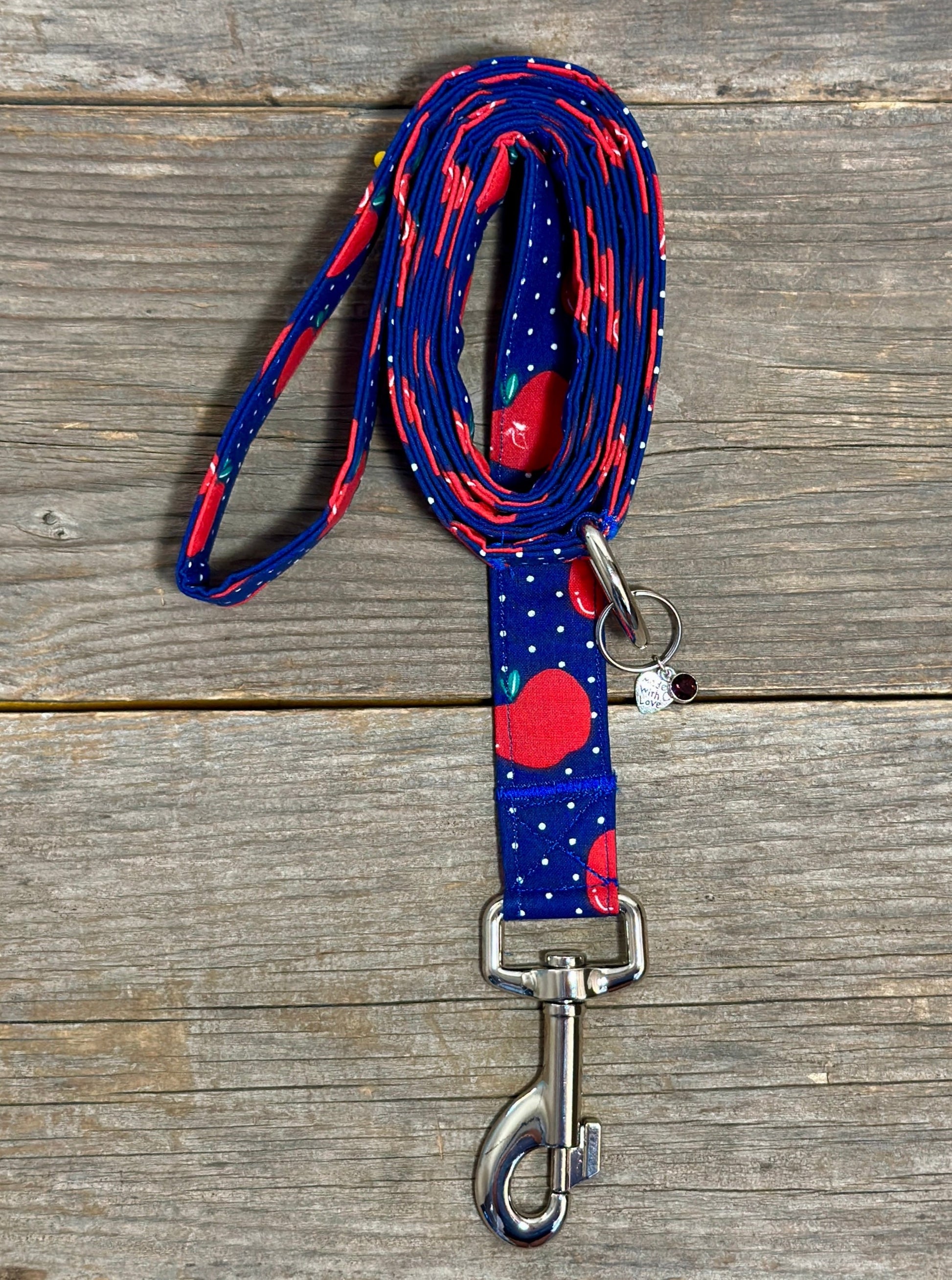 Our dog leashes are 1" wide and 5' long. Upon special request, we can make leashes longer or shorter. We can also make them 5/8" wide.