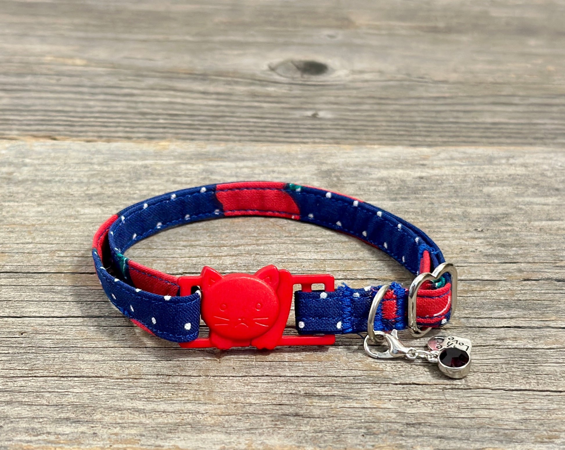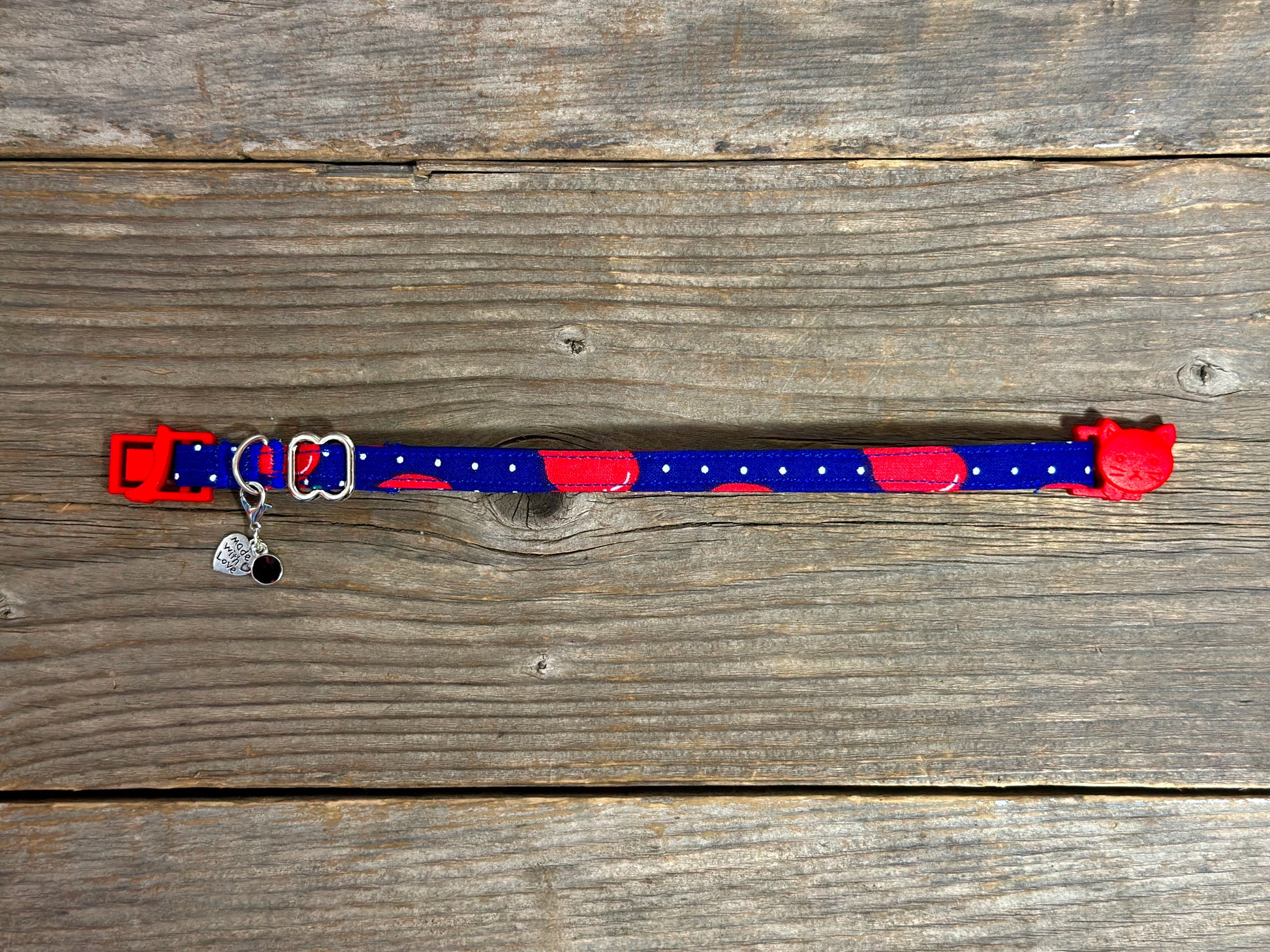 Our cat collars are 3/8" wide and have a plastic breakaway buckle.