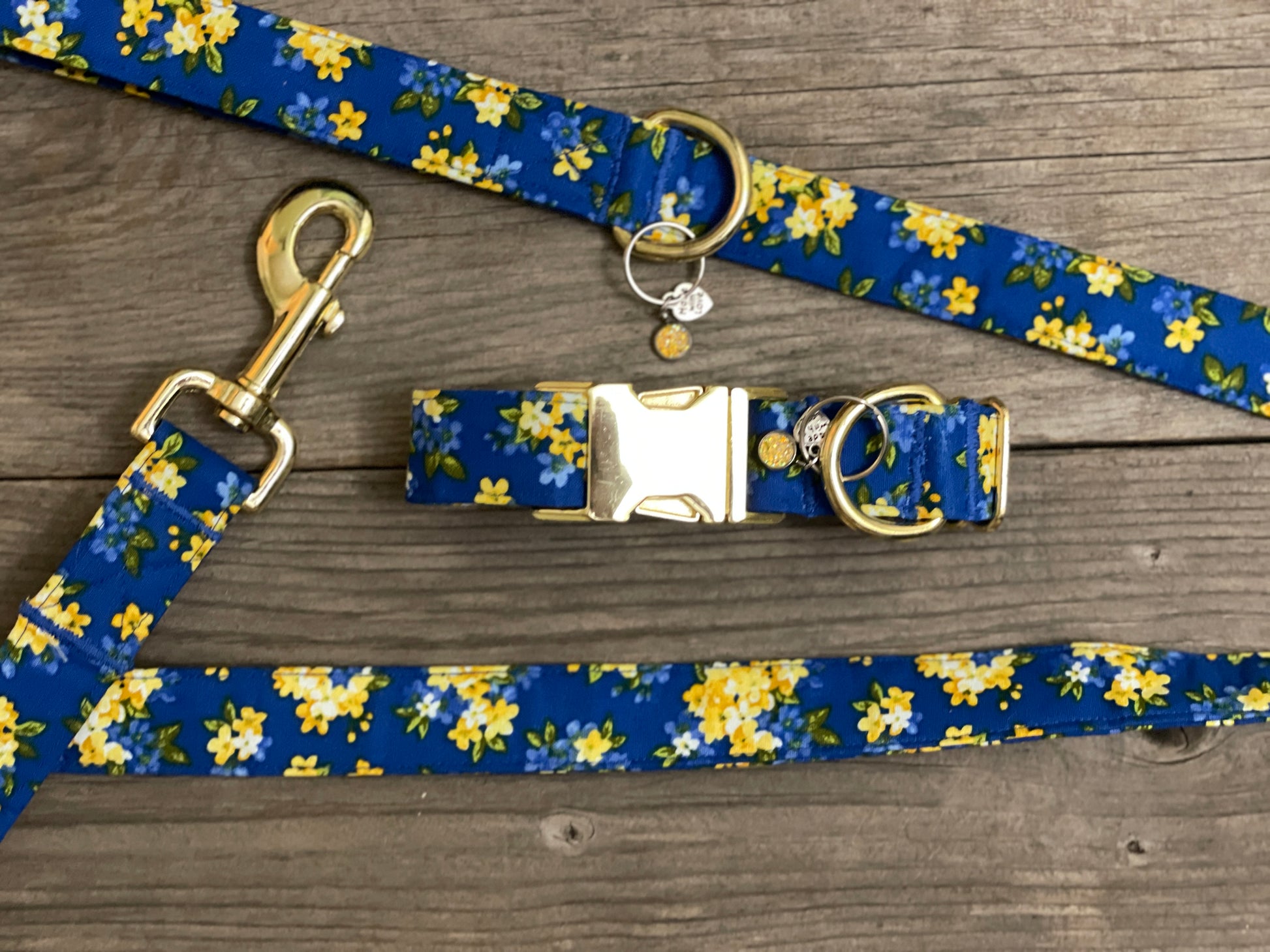 Show your solidarity and support for our friends in Ukraine with this charming blue and yellow collar. Featuring bright sunshine yellow flowers on a deep cobalt blue background, this collar conveys signs of peaceful days ahead for all of us.