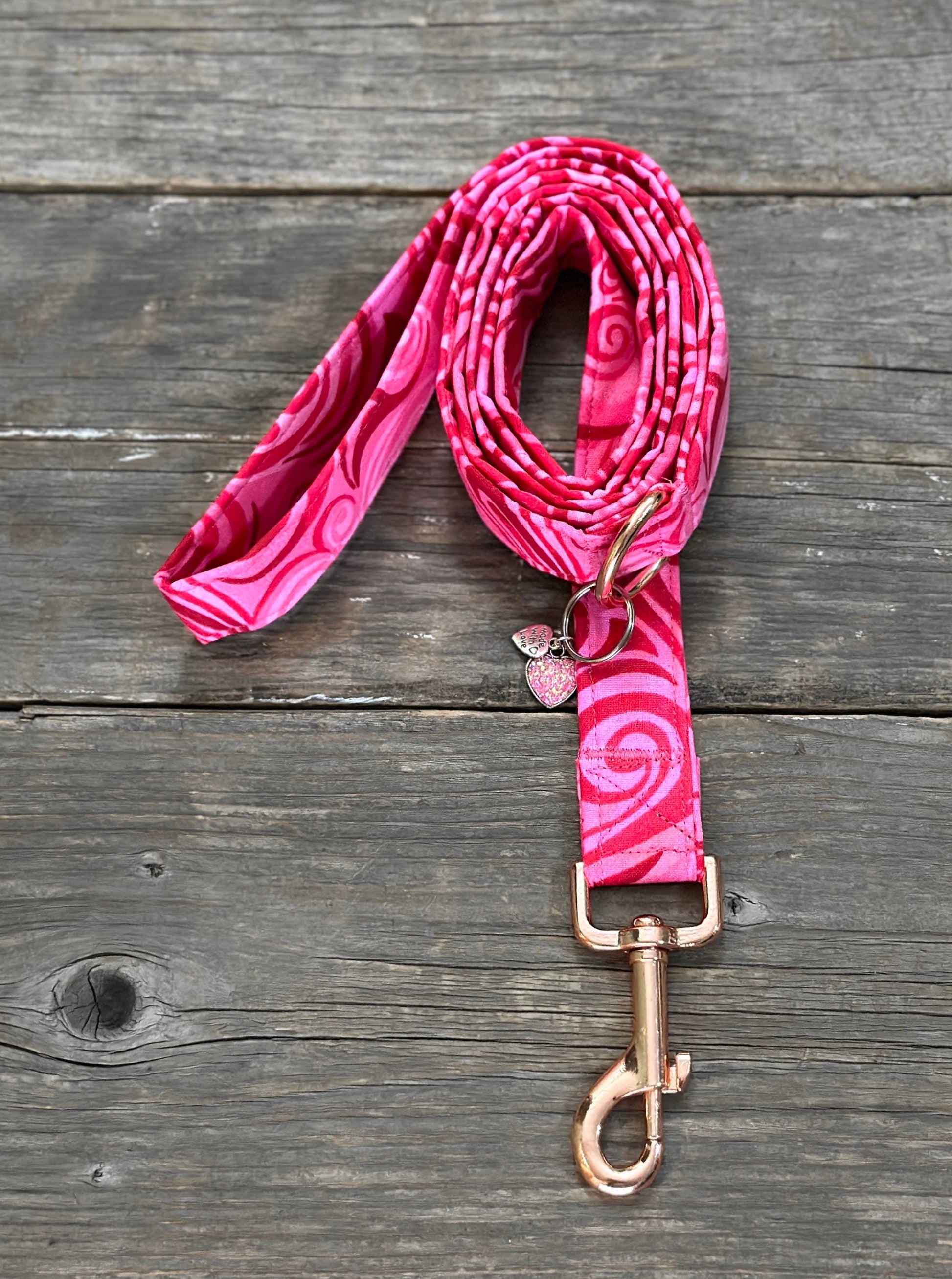 Our dog leashes are 1" wide and 5' long. Upon special request, we can make leashes longer or shorter. We can also make them 5/8" wide.