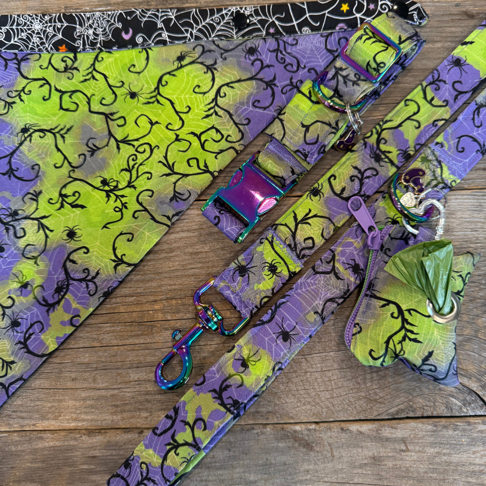 Creeping, crawling, and full of enchantment - Wicked Vines is where spooky meets spellbinding. Twisting green vines intertwine with mystical purple webs, creating a hauntingly beautiful design that feels straight out of a witch’s garden. Perfect for the pet who carries a little magic wherever they go, Wicked Vines is bold, mysterious, and just the right amount of wicked. Whether your furry familiar is prowling the neighborhood on Halloween night or curling up in their cozy cauldron at home, this design is guaranteed to turn heads (and maybe cast a spell or two).
