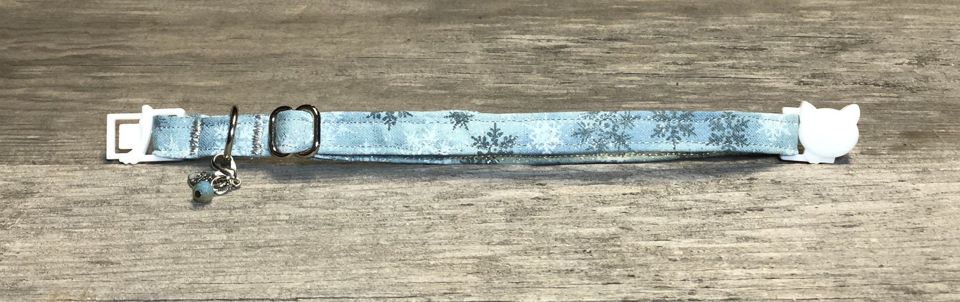 This collar feels like a fantasy. It’s ice blue background features white and grey snowflakes and has a flurry of silver glitter. It's the perfect collar for a snowy winter day. Each collar comes with a coordinating charm*. This hand-crafted collar is made with 100% cotton fabric and a breakaway clasp. This elegant collar is sure to last for years.