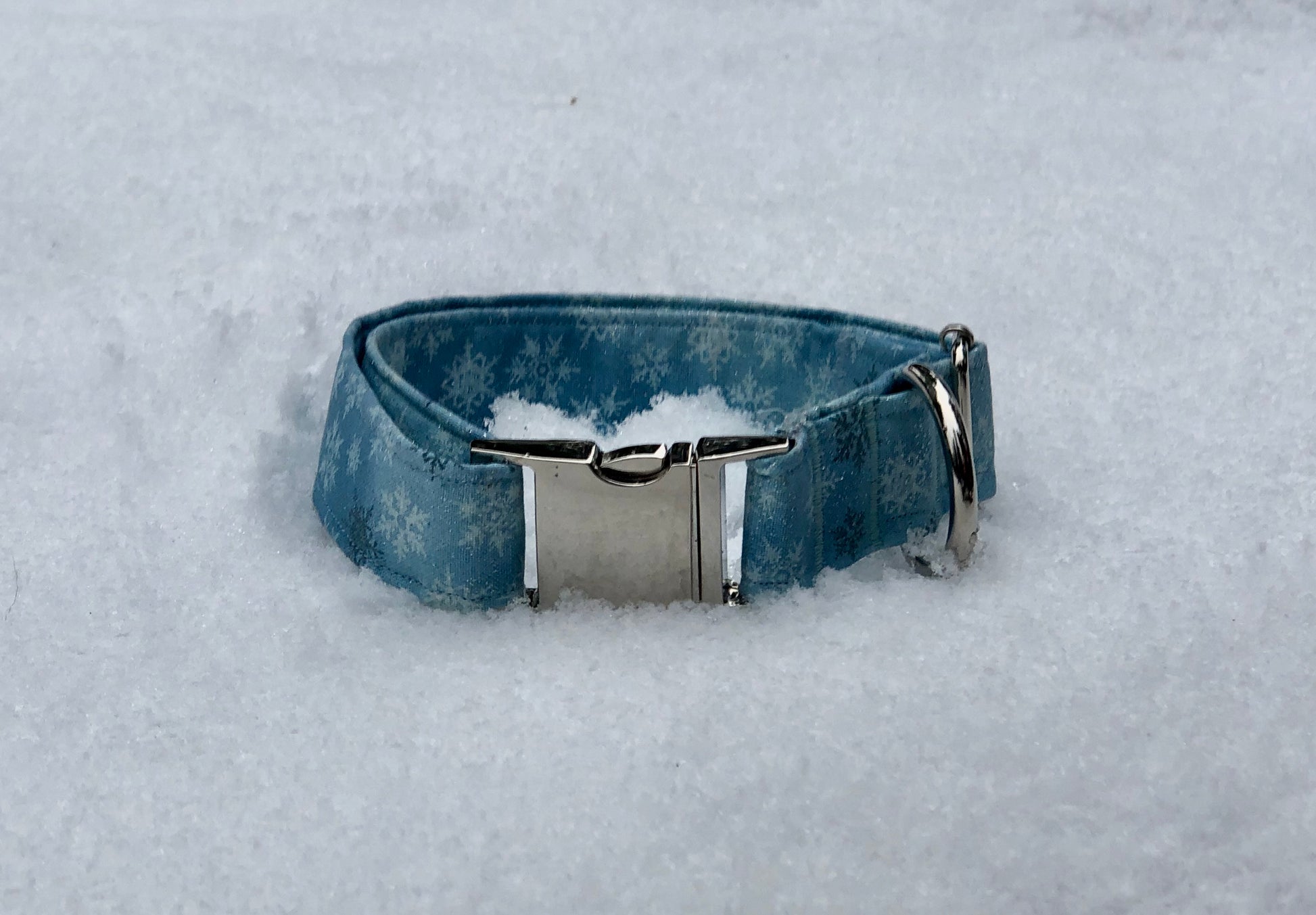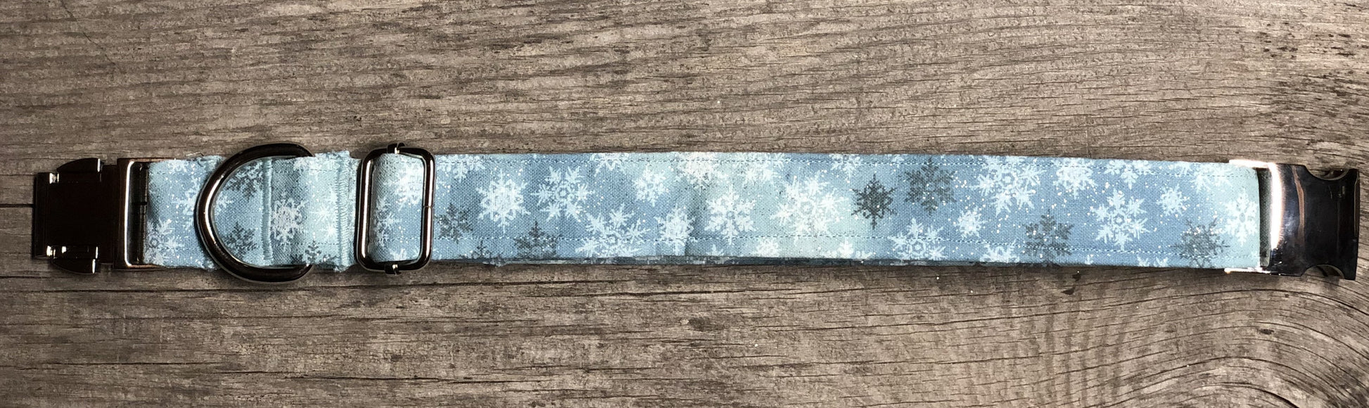 This collar feels like a fantasy. It’s ice blue background features white and grey snowflakes and has a flurry of silver glitter. It's the perfect collar for a snowy winter day. Each collar comes with a coordinating charm*. This hand-crafted collar is made with 100% cotton fabric and your choice of a metal or plastic buckle with a matching adjuster. Each collar is made with a reinforced metal D-ring. This elegant collar is sure to last for years.
