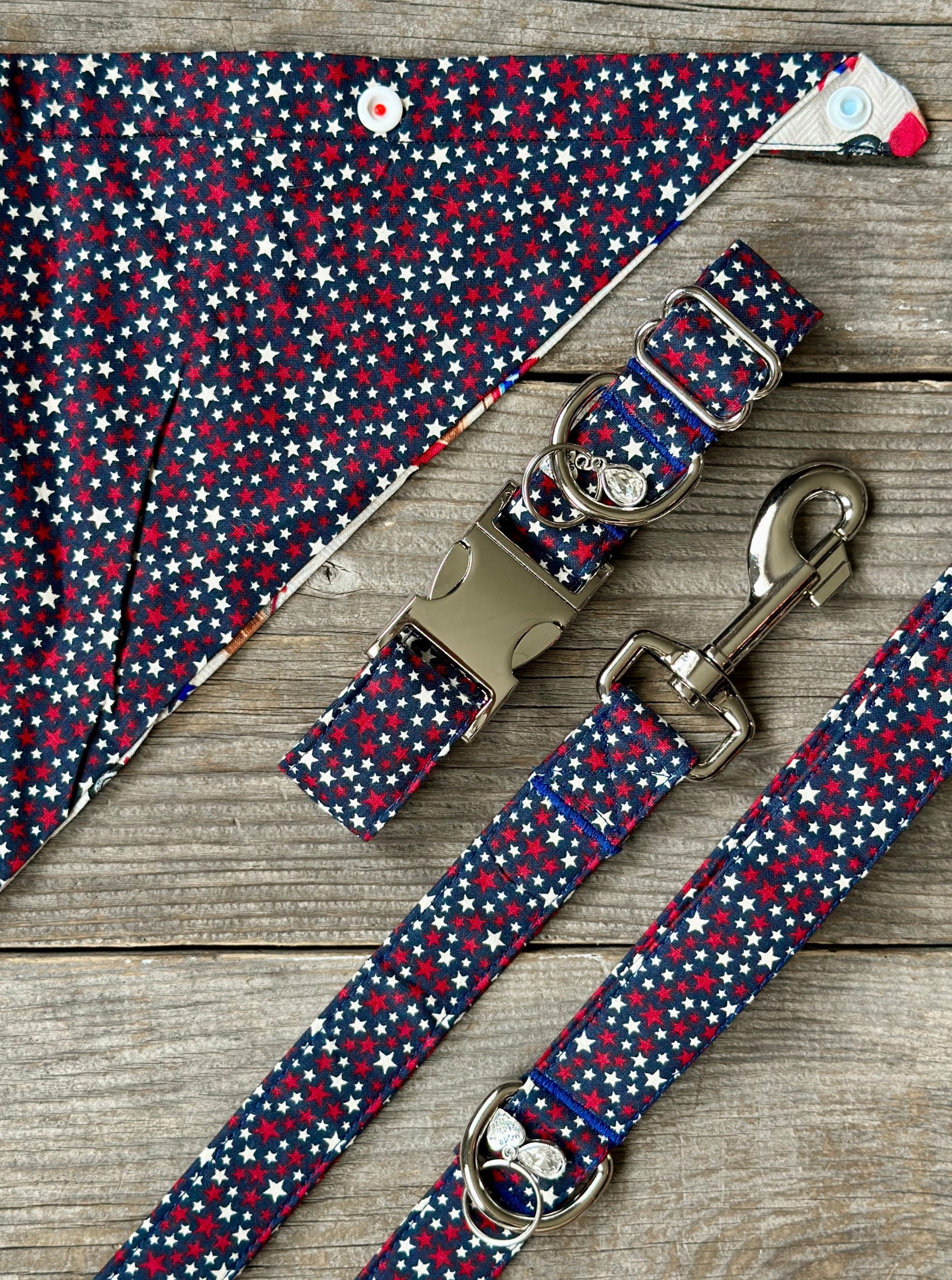 'Yankee Doodle’ is a playful and spirited pattern that showcases a vibrant dance of red and white stars across a deep navy blue backdrop. Inspired by the timeless essence of American patriotism, this design is a perfect blend of whimsy and pride. With each star twinkling like a cheerful firework, your furry friend will proudly strut their stuff, embodying the true spirit of Yankee Doodle in every step.