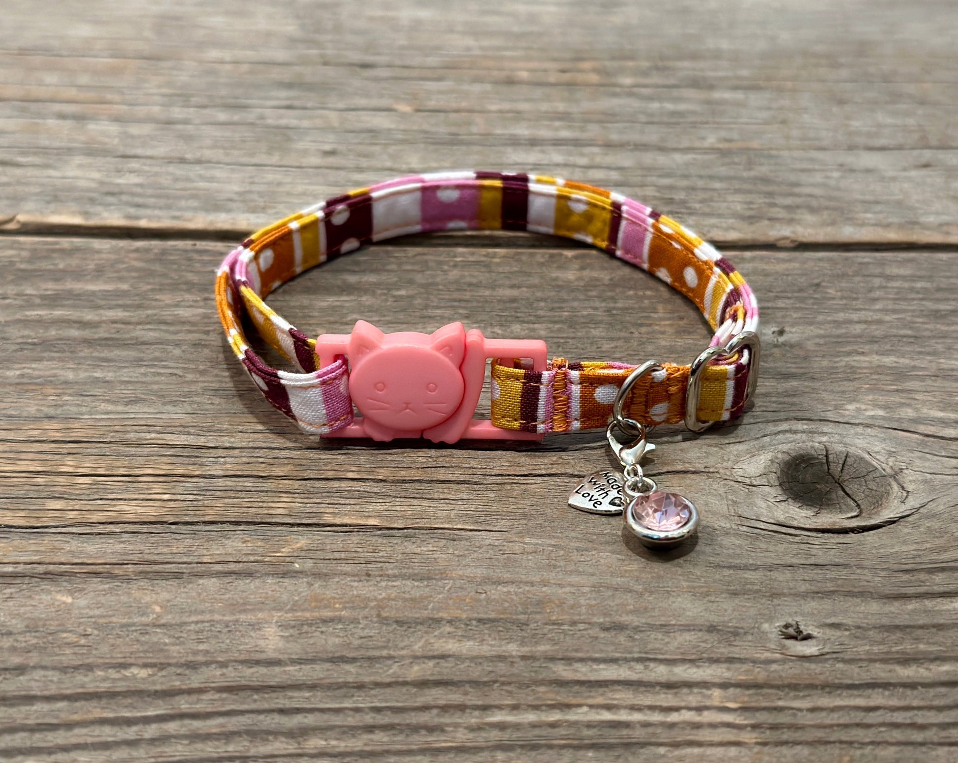 This collar is made out of 100% cotton fabric, making it easy to hand-wash! To wash, simply place it in warm, soapy water and gently rub the fabric. Rinse the collar, then dry it by laying it flat or by hanging it on a wire. If your cat has a little extra fun while wearing this collar, try using a stain-remover pen or spray.